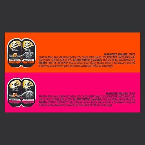 Contiene (12) 2.6-oz. Paquete de 2 bandejas de Sheba PORCIONES PERFECTAS Pate Multipack: (6) pollo sabroso y (6) Delicado Salmón Grain Free Cat Food (24 porciones en total) Bandejas de comida para gatos fáciles de usar: simplemente presiona, pela, y sirve. Las bandejas individuales de comidas frescas significan que no tendrás restos desordenados, a diferencia de los alimentos enlatados para gatos. Hecho sin granos, maíz, trigo o soja... además, sin sabores artificiales o conservantes, por lo que puedes sentirte bien con el paté húmedo que alimentas a tu felino. Deliciosamente sabroso, este paté suave y sabroso cuenta con una textura ligera y deliciosa que los gatos no pueden resistir en deliciosos sabores de pollo y salmón. De gatito a gato adulto maduro, SHEBA Wet Cat Food hace una comida sabrosa independientemente de la edad