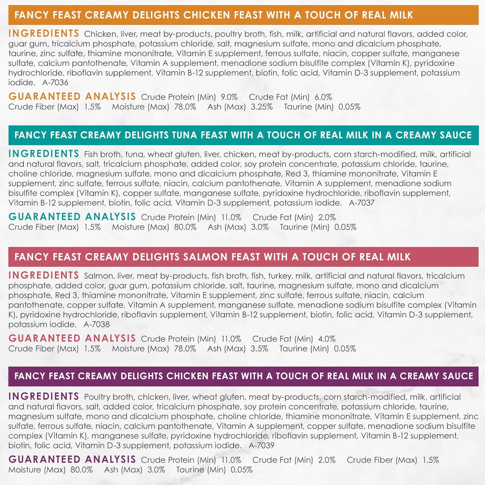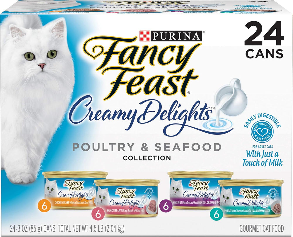 Marca Fiesta elegante de Purina Sabor Paquete variado de aves y mariscos Especies objetivo Gato Forma del artículo Coronilla Generar recomendación Todos los tamaños de raza Sobre este artículo Twenty-Four (24) 3 oz. Purina Fancy Feast Creamy Delights Paquete de variedad de alimentos húmedos para gatos adultos El paquete de variedad de latas hace que sea fácil de almacenar en sus árboles favoritos. Variedades fácilmente digeribles Los sabores de pescado y aves de corral de su gato antoja Contiene el toque correcto de leche.