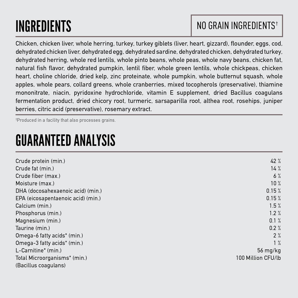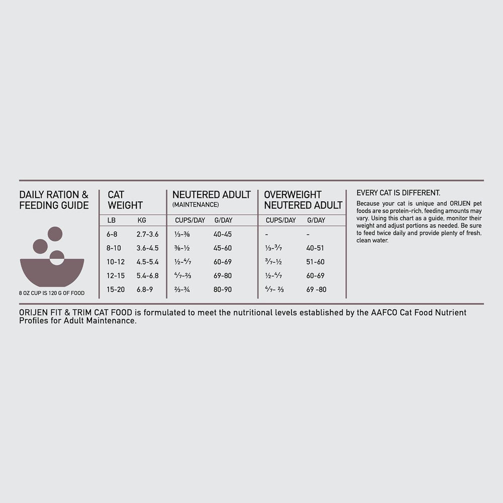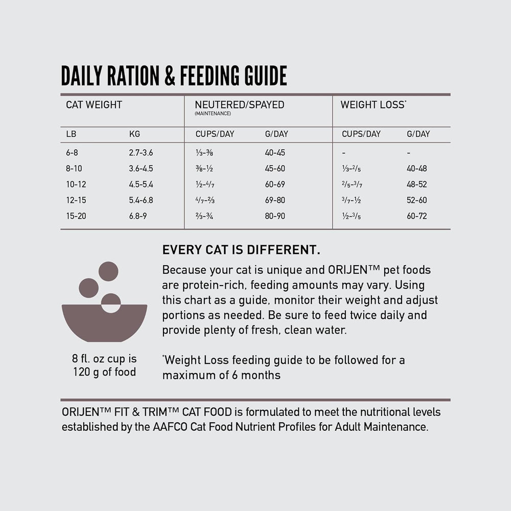 Sobre este artículo Una (1) bolsa de 4 libras de alimento seco para gatos ORIJEN Fit and Trim con ingredientes frescos y crudos Esta croqueta de ida para gatos ORIJEN está hecha para ayudar a apoyar la masa muscular magra y el acondicionamiento físico máximo para ayudar a tu gato a mantenerse saludable Alimento seco para gatos sin granos* que contiene hasta un 85 por ciento** de ingredientes anima incluidos ingredientes de presas enteras d para imitar las dietas ancestrales de los gatos Los primeros cinco ingredientes son frescos o crudos*** aves de corral y pesc por lo que tu gato puede obtener un alimento para gatos alto en proteínas con las proteínas esencia vitaminas y minerales que necesita El revestimiento de hígado liofilizado cuenta con una explosión de sabor que tu gato anhela instintivamente Ayuda a tu gato adulto a prosperar con la ida seca para gatos ORIJEN Fit and Trim. Este alimento para gatos ORIJEN está optimizado para ayudar a apoyar la masa muscular magra y el acondicionamiento físico máximo. Con una receta biológicamente apropi la ida seca para gatos sin granos* es similar a la que consumían los antepasados de tu gato en la naturaleza. Este alimento para gatos alto en proteínas incluye hasta un 85 por ciento** de ingredientes animales y sin ingredientes de grano añadidos. Los primeros cinco ingredientes de este alimento ORIJEN para gatos son ingredientes animales frescos o cru incluyendo pollo de corrida li hígado de po arenque entero y p para darle a tu gato una fuerte fuente de proteí vitaminas y minerales. Los ingredientes de ORIJEN WholePrey de órga cartílagos proporcionan a tu gato las partes más suculentas y ricas en nutrientes de la pr y el revestimiento de hígado liofilizado proporciona una explosión de sabor que los gatos anhelan instintivamente. NUTRIR O LA NATURALEZA INTENDIÓ. * Sin ingredientes de grano añadidos. Producido en una instalación que también procesa granos **Aproximado y derivado del estado sin procesar de los ingredientes. Nuestros ingredientes frescos incluidos se entregan refrigerados y nuestros ingredientes crudos incluidos se entregan congelados ****Nuestros pollos y pavos libres no están alojados en jaulas y pueden moverse en un granero sin acceso al aire libre