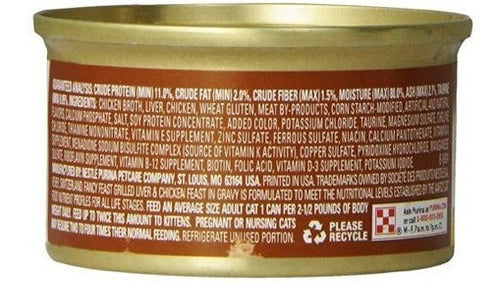 Veinticuatro (24) latas de 3 onzas de Fancy Feast Grilled Liver & Chicken Feast in Gravy Wet Cat Food. Nutrición 100 % completa y balanceada Cortes exquisitos y rellenos con bocados sabor a hígado y pollo en una salsa sabrosa. Purina Fancy Feast - Comida para gatos húmeda, en salsa, enlatada y grillada