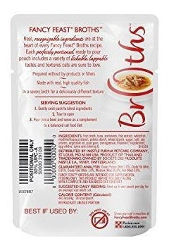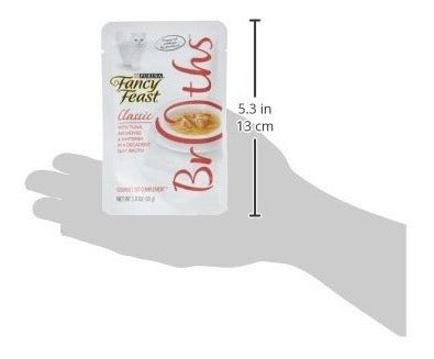 *** Características *** Dieciséis (16) 1.4 oz. Bolsas - Complemento de comida húmeda para gatos Purina Fancy Feast, caldos clásicos con atún, anchoas y pescado blanco en caldo Salsa sedosa y sabrosa que los gatos adoran Hecho con atún real, anchoas y pescado blanco que puedes ver Caldo gourmet que agregará humedad a la dieta de tu gato Bocados tiernos ofrecen una textura emocionante