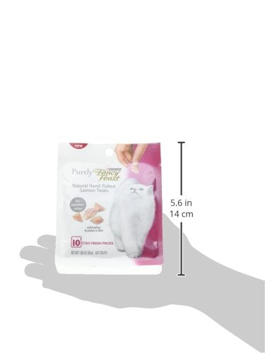 Cinco (5) bolsas de 10 unidades: Purina Fancy Feast Natural Cat Treats, salmón puramente natural escamado a mano Delicias de salmón escamadas a mano puramente festivas Solo un ingrediente: salmón Elaborado a partir de cortes selectos de pescado entero real