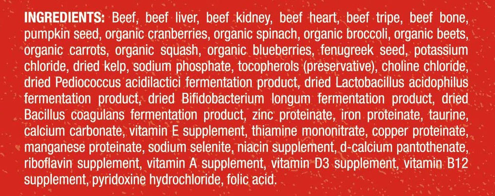 Carne de res, hígado de res, riñón de res, corazón de res, callos de res, hueso de res, semilla de calabaza, arándanos orgánicos, espinacas orgánicas, brócoli orgánico, remolacha orgánica, zanahorias orgánicas, calabaza orgánica, arándanos orgánicos, semillas de fenogreco, cloruro de potasio, algas secas,