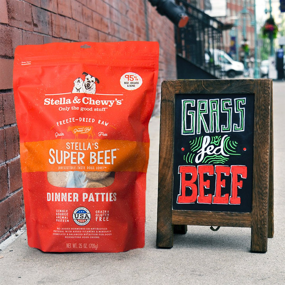 Es por eso que cada lote de Stella's Super Beef Dinner Patties comienza con 95% de carne de res (¡siempre alimentada con pasto!), Órganos y huesos, además de frutas y verduras 100% orgánicas certificadas para garantizar que su mascota coma como lo desea la naturaleza.