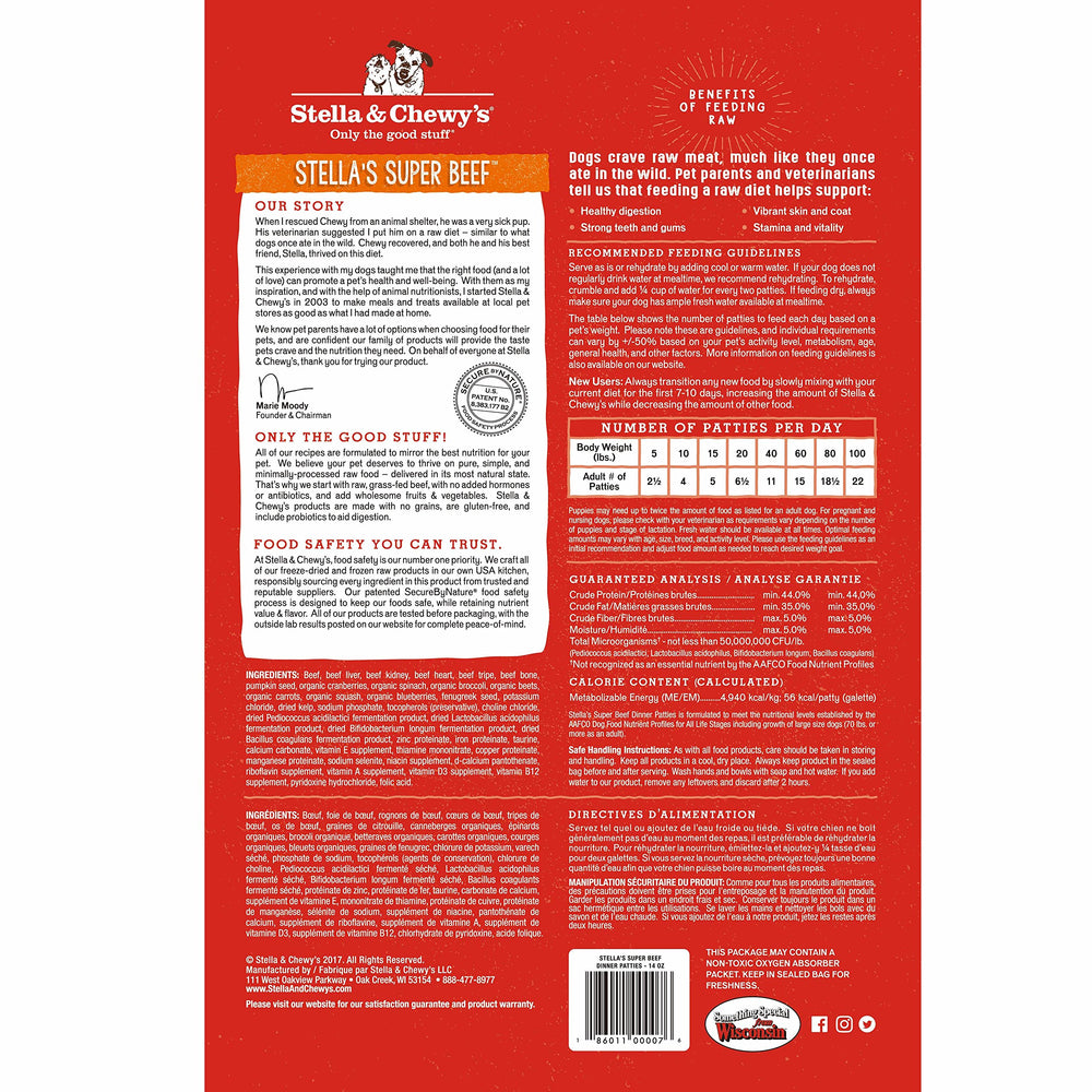 * Hecho en EE. UU .: la receta totalmente natural de Stella's Super Beef Dinner Patties está elaborada con cuidado en pequeños lotes en la propia cocina de Stella y Chewy en EE. UU. Para proporcionar los niveles más altos de carne rica en proteínas y una nutrición sin granos de calidad para su mascota