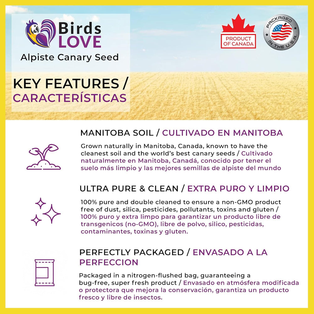 Los pájaros aman Sabor Natural Rango de edad (descripción) Todas las etapas de la vida Formulario de artículo Semilla Usos específicos del producto Dieta diaria Ingredientes Alpiste P Doble Limpi Sin Po Alpiste Acerca de este artículo Pure Alpiste: Leche Alpiste - Nuestra semilla de alpiste es p doble limpi libre de y tan libre de sílice es humanamente posible. Sin aditivos ni relle este alpiste tiene un solo ingredie puro alpiste. Hecho para pájaros pequeños: alpiste sin pelo Ideal para canar cotor periqui loros y todos los loros domésticos pequeños o especies de aves silvestres. Esta semilla para pájaros es excelente alimento para pinzo periqui semillas de caca alpiste y alimento para cualquier otra especie de ave pequeña y aves silvestres. Dieta diaria saludable: llene el vaso de semillas diariamente con semillas frescas. Nuestro alpiste está cargado de proteí aminoáci pota calcio y es una excelente fuente de la enzima lip que se encarga de eliminar el exceso de grasa corporal. ¡El alpiste y la leche alpiste son superalimentos! Frescura sellada: Empaquetado en una bolsa sellada de fábrica con nitróg lo que garantiza un producto súper fresco y libre de insectos. Este alpiste está libre de contaminan pesticidas y otras toxinas. Semillas para pájaros de alta calidad: este alimento para pája producido por Birds L es el alpiste de la más alta calidad que se puede rar. Cultivado de forma natural en Canadá y envasado en los Estados Unidos de América.