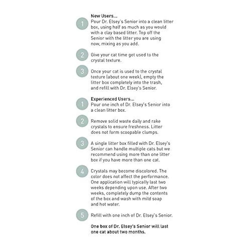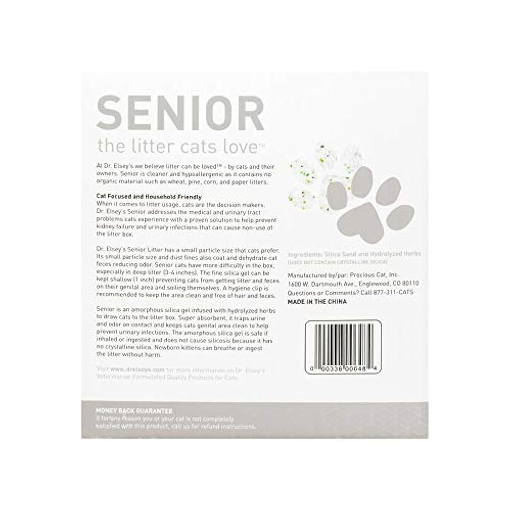 *** Características *** Ideal para personas mayores, sobrepeso o overol gatos atrapando la orina y el olor al entrar en contacto Pequeñas partículas y polvo multas Abrigo e hidrata las heces Fórmula biodegradable La arena para adultos mayores del Dr. Elsey absorbe la orina y el olor al contacto y la atrapa dentro de los cristales, manteniendo limpia el área genital de un gato para ayudar a prevenir infecciones del tracto urinario. Su pequeño tamaño de partícula y polvo fino también recubre y deshidrata las heces de gato para reducir el olor. El Dr. Elsey's Senior es más limpio e hipoalergénico, ya que no contiene basura de trigo, pino, maíz y papel.