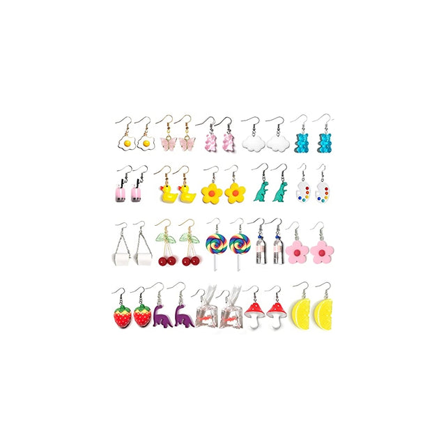 Diseño moderno: hecho a mano y estilo único independiente en línea con la estética. Varios estilos: este divertido juego de pendientes colgantes incluye huevo, mariposa, oso de goma rosa y azul, blanco nube, rosa té de leche Boba, pato de goma amarillo, margarita amarilla y rosa, dinosaurio verde fucsia, pintura, papel higiénico, cereza, piruleta, botella de agua, naranja, fresa, bolsa de pescado dorada, champiñón rojo. El paquete incluye: incluye 20 pares de diferentes pendientes colgantes, suficiente estilo y cantidad para que elijas para que coincida con tu atuendo Varias ocasiones: artículos Kawaii para ropa diaria, fiestas de cumpleaños, viajes de vacaciones, festivales, vacaciones, etc. Te hacen lucir encantadora y ganar más cumplidos.