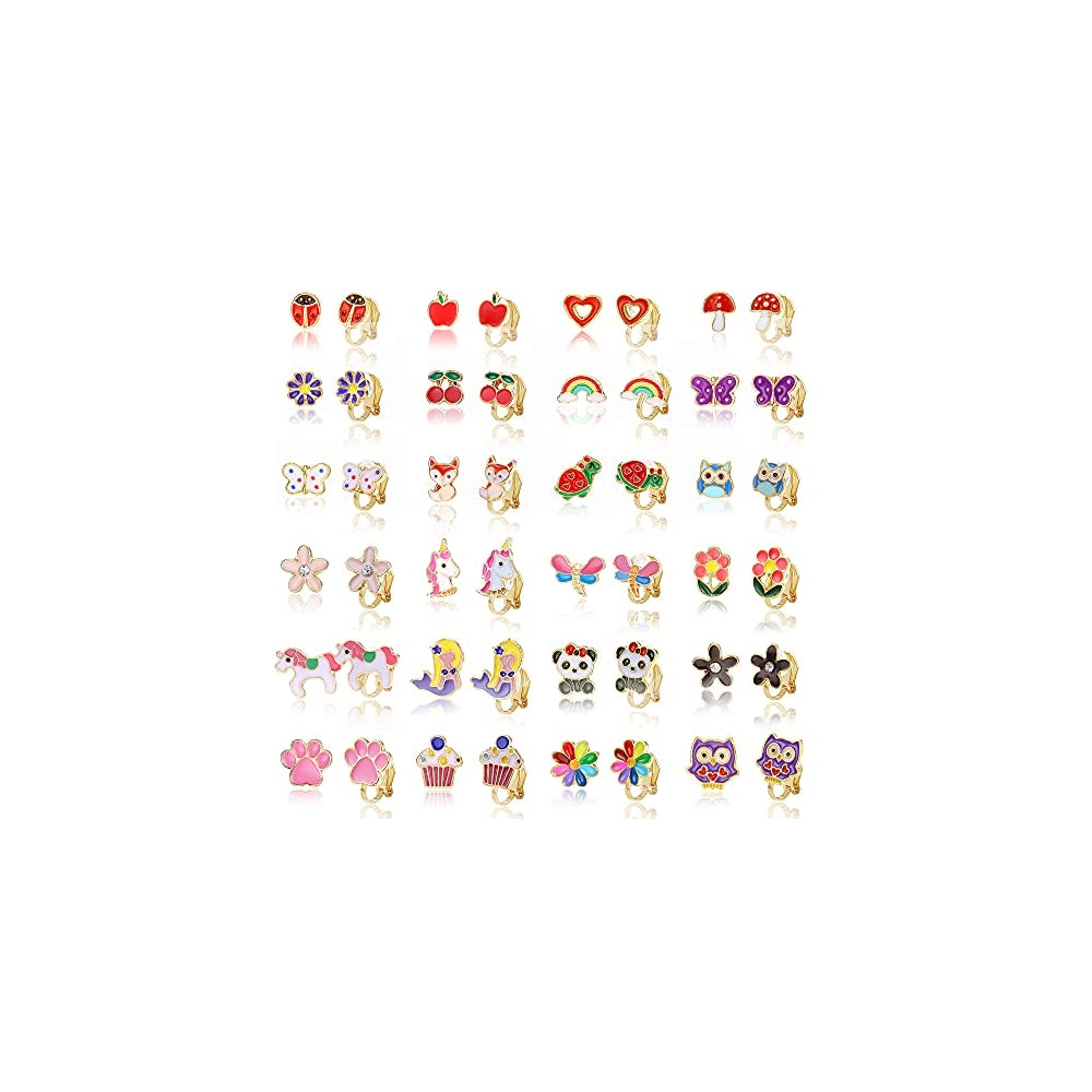 Pendientes de clip para no perforar: pendientes únicos sin perforar con cierre de clip, fáciles de poner y quitar, adecuados para orejas no perforadas y para personas a las que les gustan los pendientes de clip. Vienen con almohadillas de goma suaves y antideslizantes, pueden liberar el estrés de los pendientes y mantener los pendientes en el lóbulo firme, cómodos de llevar durante mucho tiempo. Bonitos pendientes de flor de animal: un pedido contiene 24 pares de pendientes surtidos en diferentes diseños: animales, unicornio, sirena, mariposa, princesa, corazón, estrella, corona, helado, fresa, cereza, piña, flor y muchos otros diseños. Hay toneladas de estilos bonitos para elegir, puedes sorprender a todos con tu elección diferente para el día. Se adapta a la mayoría de las mujeres: los pendientes están hechos de aleación de alta calidad, diferentes formas con colores mezclados, bonitos y modernos, ya sea que tengas 4, 14 o 47 años, estos se ajustan perfectamente. Los pendientes son tan esenciales y divertidos que te hacen desear que puedas llevarlos todos de verdad.
