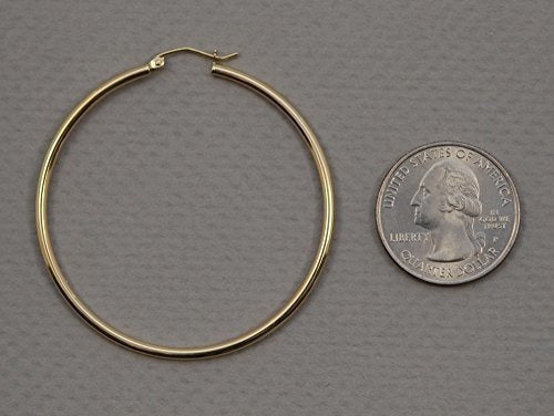 52 milímetros de alto 2 milímetros de ancho TAMAÑO: Diámetro de los pendientes: 50 mm (2 pulgadas); Ancho: 2 mm (0,08 pulgadas); Cierre: cierre de clic; Este artículo es de oro de 14k y no chapado en oro. MODA: nuestros clásicos pendientes italianos de oro de 14k son el accesorio perfecto para cualquier ocasión. Su fácil cierre de clic hace que sea muy fácil de poner y los mantiene seguros en sus oídos todo el día y toda la noche. ESTILO: estos aretes tienen un aspecto clásico, simple y tradicional de aro en oro amarillo de 14k. Tienen un acabado altamente pulido y brillante. EMBALAJE: cada artículo viene perfectamente empaquetado en una atractiva caja de regalo de joyería LooptyHoops junto con instrucciones sobre el uso y cuidado de sus joyas y un código de descuento válido en futuras compras.