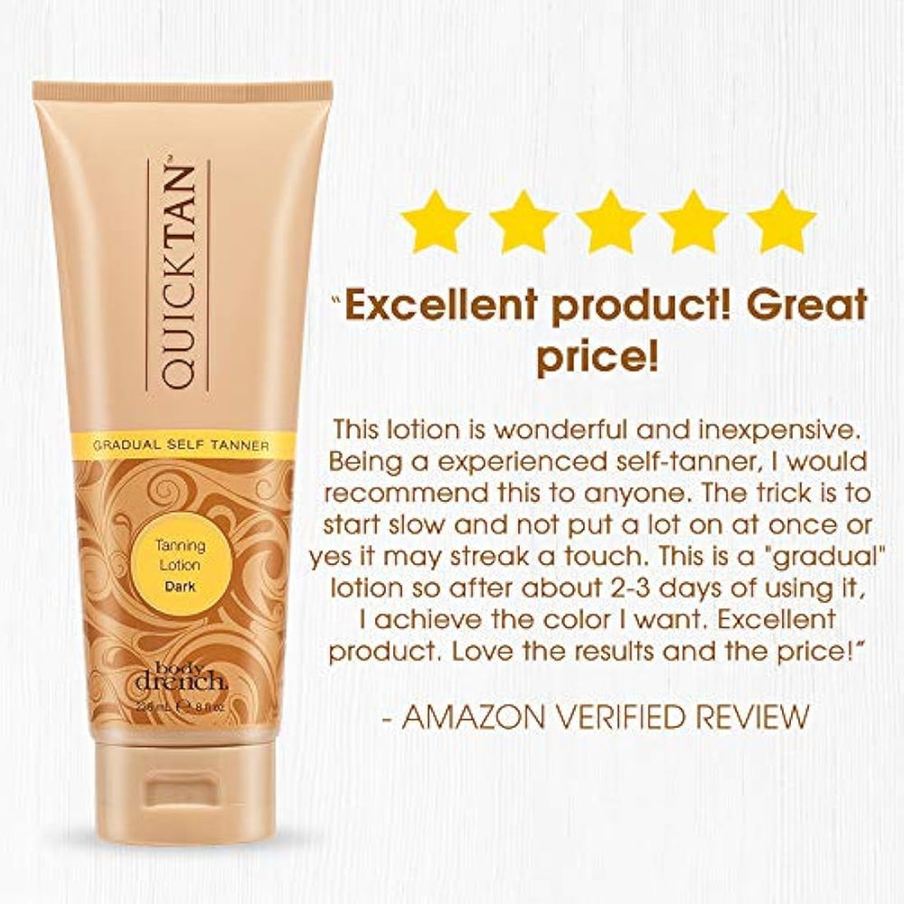 *** Características *** TODO EL AÑO, MANTENGA UN BRONCEADO DEL BRONCEADOR DE PLAYA: ¡Cambie su humectante diario por este bronceador para mantener un bronceado fresco de la playa, temporada de bikini o no! La crema bronceadora ideal para los meses de invierno y verano para lograr un bronceado duradero y sin parches. Suave pero efectivo para la piel y le ahorra la molestia de sentarse al sol tratando de broncearse, dañando su piel Está libre de parabenos y r endado por dermatólogos, por lo que es perfecto para las personas con piel sensible o que se irrita fácilmente LOGRA UN BRILLO DE PIEL NATURAL Y SALUDABLE: para un brillo bronceado natural y saludable, el Body Drench Quick Tan es una gran opción. Protege su piel mientras le da un hermoso bronceado sin sol, con un brillo que irradia por más tiempo que la mayoría de los autobronceadores. El bronceado resultante será gradual e incluso sin rayas ni manchas anaranjadas. ¡Se bina bien en diferentes tonos de piel y también ayuda a cubrir áreas más oscuras de la piel LOCIÓN DIARIA ABSORBENTE RÁPIDA: en una misión para eliminar estos crímenes pasados, esta loción diaria liviana se desliza fácilmente y gradualmente crea un tono convincente tocado por el sol. Se seca muy rápido cuando golpea tu piel. Formulado con activos correctores de color que están clínicamente probados para igualar el tono de su piel Se seca al contacto, por lo que no tendrá que preocuparse por dejar parte de su bronceado en todas partes. Esta loción Quick Tan de rápida absorción de Body Drench hace que sea más fácil prepararse rápidamente