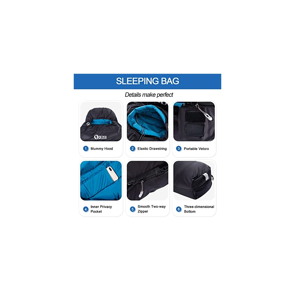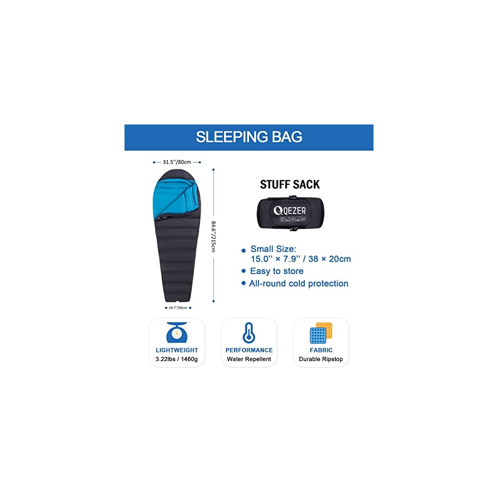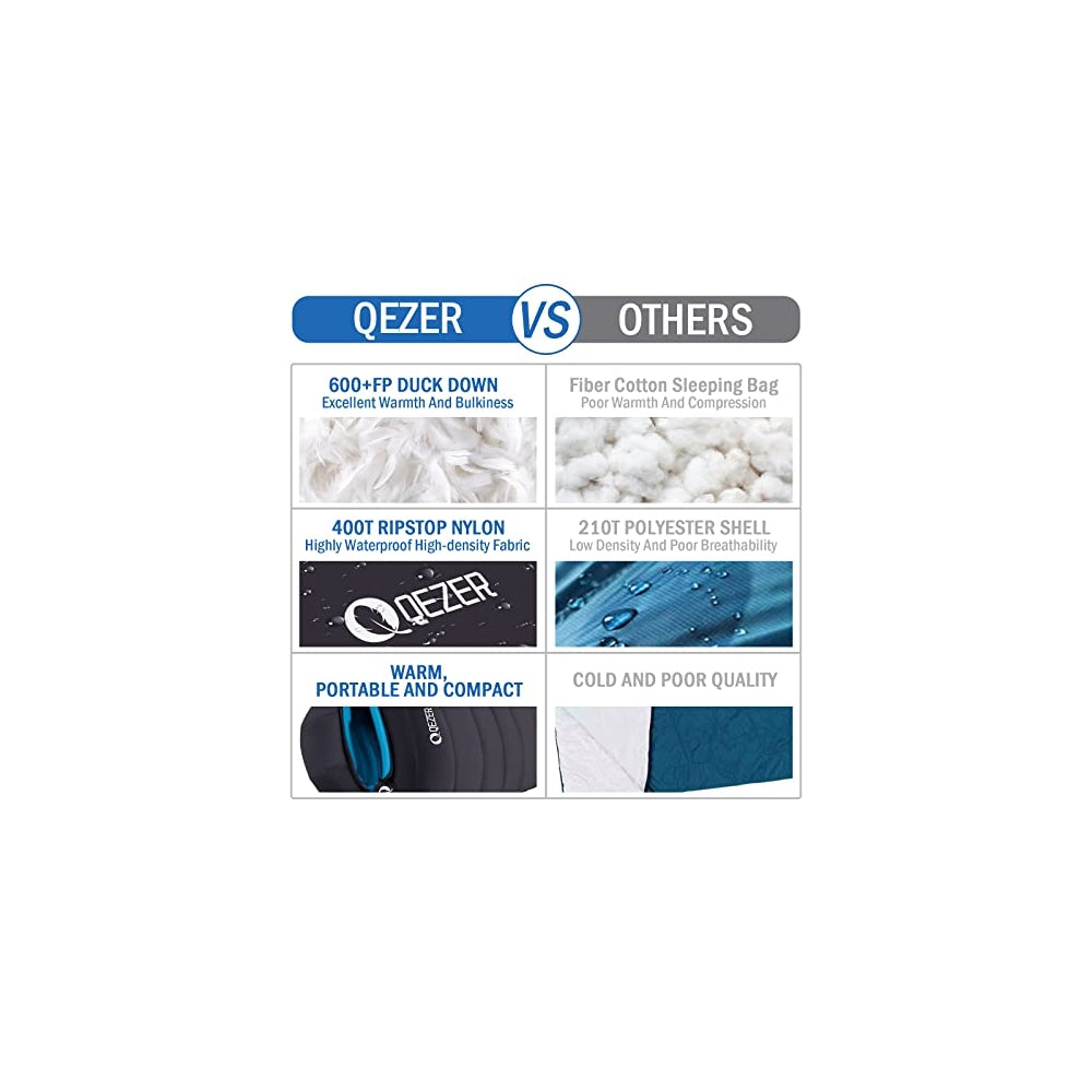 El saco de dormir ultraligero está relleno con plumón de pato natural esponjoso y suave de 28.22 600 + potencia de rell tiene una excelente expansión y te da una sensación ligera y su manteniéndote caliente toda la noche. Temperatura cómoda: 26°F-4 temperatura limitada: 14°F. (Nota: el producto está extremadamente rimido cuando se almac se r enda ventilar durante 3-4 horas después de abrirlo) Saco de dormir de plumón: tamaño de uso: 84.6 x 31.5 pulga tamaño de almacenamiento: 15.0 x 7.9 pulga peso: 3.2 libras. Tiene aproximadamente la mitad del peso y el volumen de un saco de dormir de algodón de poliés ideal para acampar. El saco de dormir para mochilero es súper acto y fácil de llevar. La bolsa interior puede contener objetos pequeños llaves y teléfonos móviles. Al almace puedes drenar letamente el aire en el saco de dor enrollarlo y empujarlo en la bolsa de almacenamiento. ?Diseño fácil de diseñar?El saco de dormir para mamá para adultos tiene un ajuste cóm la parte inferior adopta una amplia caja trapezoidal para p que no se sentirá apretada cuando duermes. Fija las cremalleras izquierda y derecha y también se puede utilizar un saco de dormir par perfecto para viajes familiares. Las capas exteriores e interiores del saco de dormir están hechas de tela de nailon 400T40D resistente a desgar tela de ultra alta densidad con excelente rendimiento impermeable y también puede evitar el desbordamiento de plumón. ? Diseño ?Este saco de dormir es perfecto para primav ver otoño e invierno f pequeño y práct fácil de lle adecuado para todo tipo de actividades al aire li camp mochile senderi avent montañi escapada de emergen e también es una excelente opción para uso en hotel. QEZER siempre proporciona a nuestro s los mejores productos y envio de saco de dormir con diseño elega plumón premium y funciones más perfectas para exteriores.