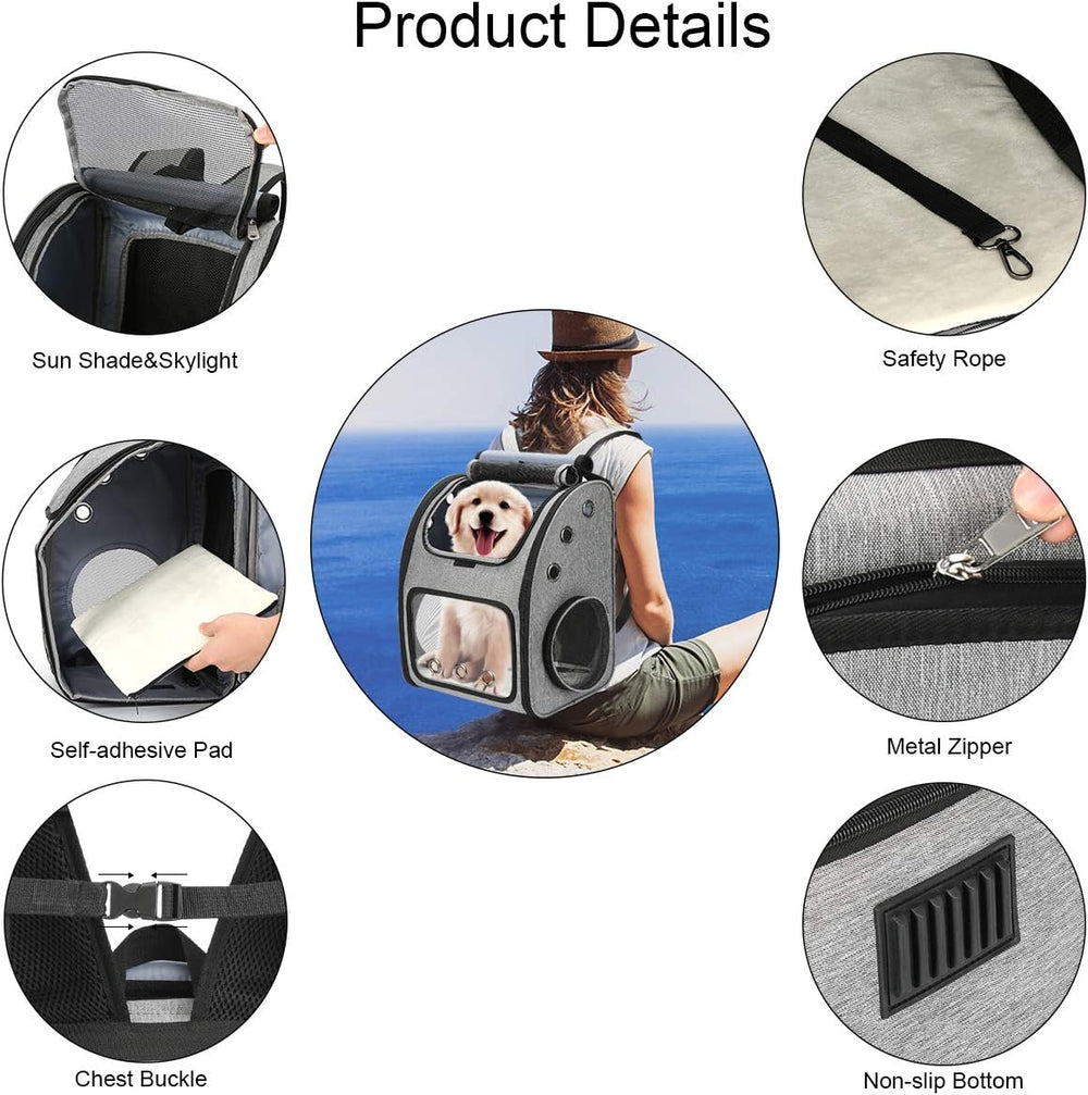 Diseño expandible trasero: con el diseño expandible tras el espacio dentro de la mochila se puede duplicar. No solo aumenta la circulación del a sino que también permite que tu mascota permanezca en él más cómodamente y se mueva más libremente Mejor ventilación y visibilidad: la mejora más importante de esta mochila e una excelente ventilación y visibilidad al mismo tiempo. 1 gran ventana acrílica transpare 3 ventanas de malla transpirable y 9 agujeros de ventilac proporcionan un montón de aire y una excelente visión para tu mascota Estructura resistente y segura: equipada con una estructura firmemente reforz para evitar que la mochila se colapse en tu mascota mientras viajas. Cuando abras las ventanas de malla superiores para dejar que tu mascota pegue su cab la cuerda de seguridad interior puede evitar que tu perro se escape Cómodo de llevar: viene con hebillas de cintura y pe para darte apoyo adicional y mantener la estabilidad de la moch evita que las mascotas se resbalen. Las correas de hombro están equipadas con acolchado extra grueso para mayor didad durante viajes largos Mide a tu mascota antes de rar: su tamaño externo es de 13.4 pulgadas de largo x 10.2 pulgadas de ancho x 16.5 pulgadas de a mientras que el tamaño interno es de 13.0 pulgadas de largo x 9.3 pulgadas de ancho x 14.8 pulgadas de alto y puede ser de 13.0 pulgadas de largo x 21.5 pulgadas de ancho x 14.8 pulgadas de alto después de expandirse letamente. La carga máxima r ndada es de 18 libras. No selecciones el tamaño de la mochila en función del p consulta la longitud de tu mascota (pies delanteros a base de la cola) y la altura (suelo a parte superior de la cabeza) para seleccionar un tamaño de mochila