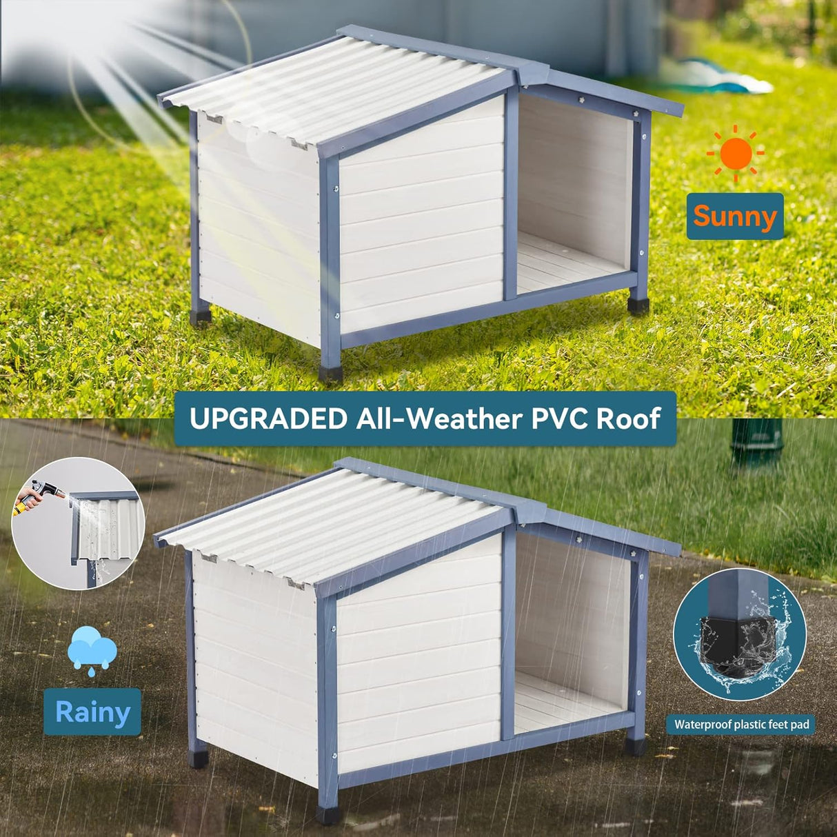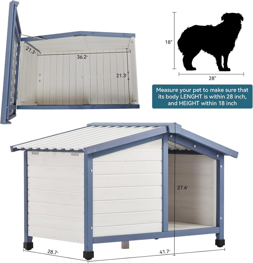 Petsfit Dimensiones del producto 28,74"D x 41,73"Ancho x 27,56"Altura pulgadas Material Madera Color Blanco Estilo Moderno Sobre este artículo Diseño estructural resistente a la intemperie: esta casa exterior para perros cuenta con un techo de PVC y una solapa de puerta de plást ofreciendo una impermeabilidad y durabilidad superiores en aración con los techos de asfa por lo que es perfecta para proteger a tu mascota del viento y la lluvia. También se puede utilizar casa para perros al aire libre. Cálida en invierno: esta casa para perros exterior está hecha de madera de ab conocida por su naturaleza lig propiedades de secado rápido y excelente durabilidad. Junto con una solapa de puerta de plástico resistente al viento y a la llu proporciona un hogar de invierno cálido y acogedor para tu mascota. Pies elevados ajustables: esta casa exterior para perros cuenta con patas elevadas de plástico ajustables que la elevan por encima del suelo y se pueden ajustar a una altura adecu proporcionando una mejor ventilación y manteniendo el interior s protegiendo a tus mascotas de las picaduras de insectos. Fácil de montar y limpiar: esta casa para perros exterior tiene una estructura simple con agujeros preperfora lo que hace que el montaje sea fácil siguiendo las instrucciones. También cuenta con un techo que se puede abrir y un piso extraí lo que permite una fácil limpieza del inter proporcionando a tu mascota un hogar limpio y sanitario. Adecuado para perros pequeños o medianos: nuestras casas medianas para perros miden 41.73 pulgadas de largo x 28.74 pulgadas de ancho x 27.56 pulgadas de alto. Es ideal para perros medianos un adulto con un peso de hasta 60 libras. Deja que tu mascota se sienta más segura cuando se quede dentro de la casa para perros al aire libre.