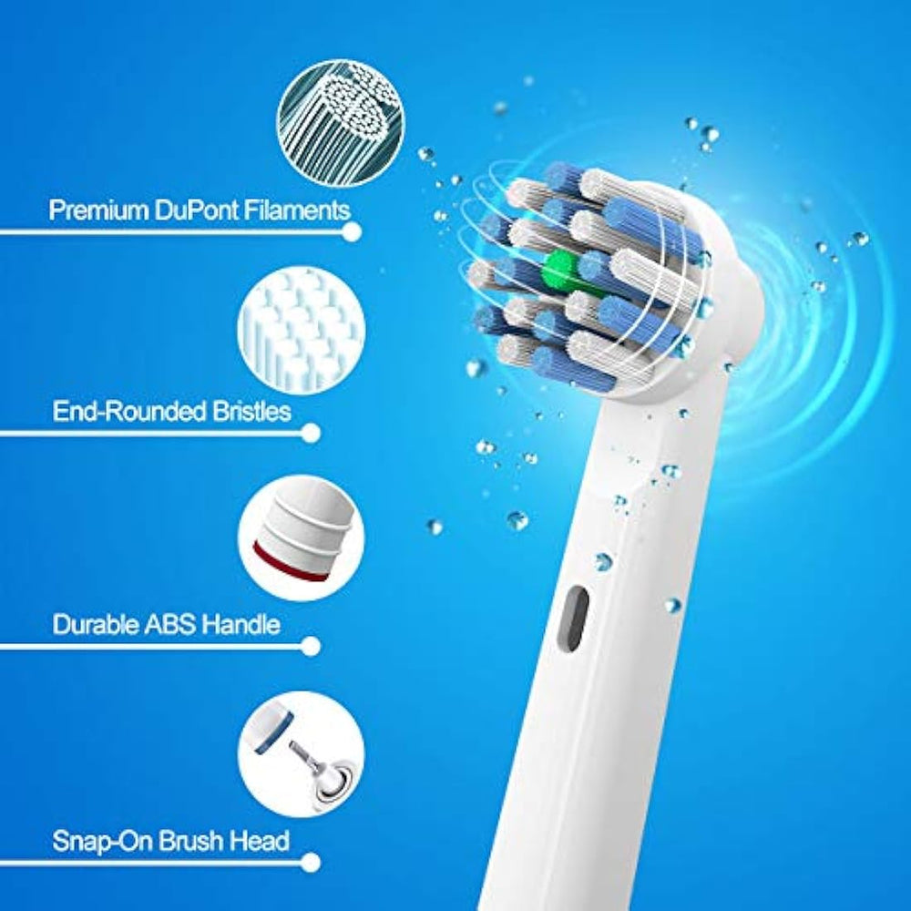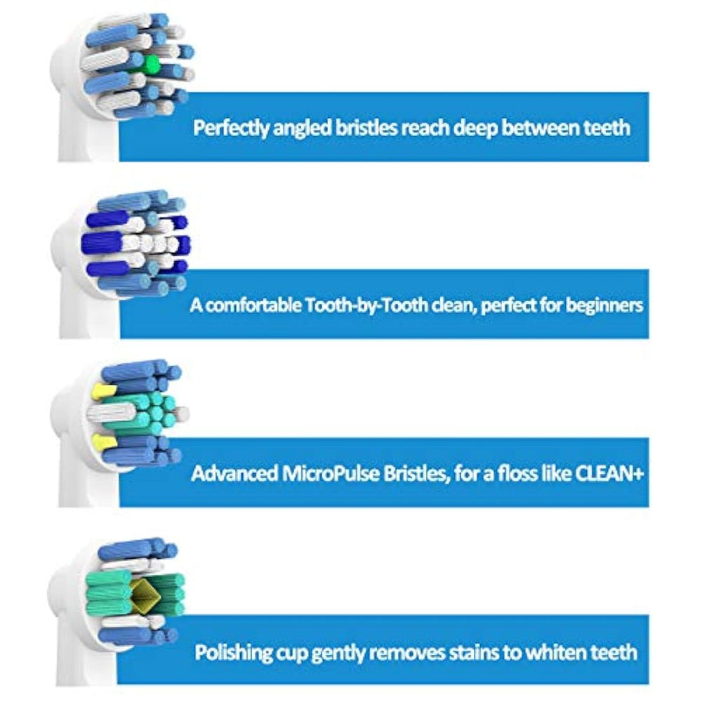 16 cabezales de repuesto para cepillo de dientes Oral B: incluye 4 acciones de hilo, 4 acciones cruzadas, 4 limpiadores de precisión y 4 blancos 3D, los cabezales de cepillo eléctrico Homelink se adaptan a todas tus necesidades personales. (NOTA: Homelink no está asociado con Oral B) Gran patibilidad: los cabezales de repuesto Homelink pueden adaptarse a la mayoría de los cepillos de dientes eléctricos Oral B o ORAL B PRO, Genius y Smart Series, excepto Oral B Pulsonic. Elimina la placa y blanquea tus dientes: los cabezales de cepillo B orales de Homelink están diseñados ergonómicamente para eliminar la placa de forma eficiente y alcanzar la profundidad entre tus dientes, ofreciendo una experiencia de limpieza cómoda. Cerdas DuPont de alta calidad: los cabezales de cepillo de dientes eléctrico Homelink para Oral B adoptan filamentos DuPont, que han sido aprobados o el ápice de calidad en la industria de filamentos sintéticos de cuidado oral.