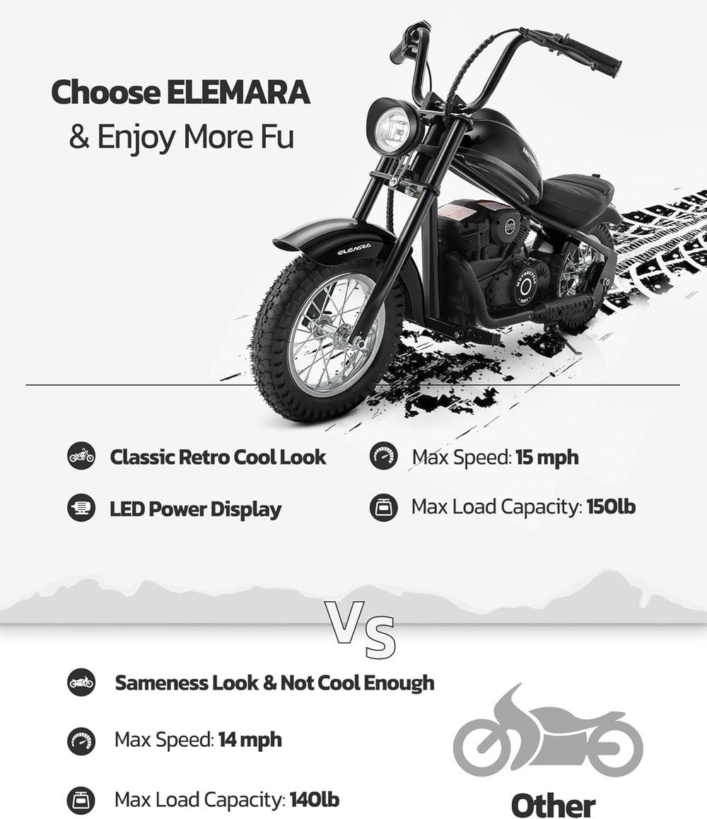 Acerca de este art ?Motocicleta eléctrica cool y elegante?Esta moto cuenta con un diseño exterior clásico y supr viene con luces LED y un display de potencia para visibilidad y conveniencia. Arranque con llave y acelerador de g ¡haciendo que cada paseo sea más reali fresco y agradable! ?Motocicleta eléctrica de alto rendimiento?La motocicleta eléctrica ELEMARA para niños está equipada con un motor potente de 24V 2 alcanzando velocidades de hasta 15 mph y un rango máximo de 10 mil mientras que su capacidad máxima de peso de 150 lb asegura diversión para niños de diferentes tamaños. ?Neumáticos grandes de 12" llenos de aire para cualquier terreno?Las ruedas de caucho inflables resistentes al desgaste están diseñadas específicamente para conquistar cualquier terreno fácilmente y ofrecen una impresionante aceleración y rendimie el asiento de cuero suave te hace más cómodo durante el paseo. ¡Prepárate para la diversión todoterreno AHORA! ?Seguridad primero?Mantente bajo control con los innovadores resortes de choque del asiento trasero y el freno trasero de accionamiento man asegurando un paseo seguro y emocionante mientras tu joven aventurero construye su confianza sobre ruedas. Por fa ¡siempre usa casco y equipo de protección (rodilleras y coderas) al montar! ?Regalo único para buscadores de aventuras?Nuestra Motocicleta Eléctrica para Niños es un regalo fantástico que despertará alegría y emoc ¡perfecto para cumplea vacaciones y más! ¡Prepárate para liberar el espíritu aventurero de tu hijo con nuestra Motocicleta Eléctrica! ? Ver más detalles del producto Información del producto Tipo de bicicleta: Bicicleta eléctrica Rango de edad: Niño grande : ELEMARA Número de velocidades: 3 Color: Negro Tamaño de la rueda: 12 pulgadas Material del marco: Metal Tipo de suspensión: Trasera Característica especial: Faro Componentes incluidos: Bicicleta eléctric Manual*1 Tamaño: Grande Estilo de freno: Freno en U Peso del artí : 48.7 libras Tema: Deporte Nombre del modelo: WJL017HEN0X Fuente de alimentación: Motor eléctrico Potencia: 2.5E+2 vatios Material del asiento: Cuero R endación de peso máximo: 1.5E+2 libras Requiere ensamblaje: Sí Número de manubrios: 2 Nivel de habilidad: Intermedio Material del guardabarros: Metal UPC: 840325663012 Fabricante: ELEMARA Dimensiones del producto: 44.9 x 23.6 x 29.8 pulgadas Número de modelo del artí : WJL017HEN0X Edad r endada por el fabricante: 13 - 16 años Mejor rango de ventas number 70,576 en Juguetes y Juegos (Ver los 100 mejores en Juguetes y Juegos) Calificación de lo s: 5.0 de 5 estrellas Fecha de lanzamiento: 25 de agosto de 2024 del producto: Para obtener información sobre l de este produ hag **Por fa inicie sesión para proporcionar entarios.**