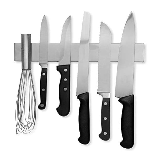 *** Características ***   Potente barra magnética para cuchillo: esta moderna barra magnética para cuchillos está cubierta de un elegante acero inoxidable de alta calidad con acabado satinado que plementará la decoración de tu cocina. Diseño moderno y resistente: esta barra de cuchillos de última generación tiene una superficie totalmente magnética alimentada por un fuerte imán de neodimio que te permite colgar de forma segura incluso tus cuchillos de cocina más grandes al instante y de forma segura. Organiza todo: esta tira magnética tiene una longitud extendida que te permite más cuchillos que la mayoría de los bloques de cuchillos en el mercado mientras que sigue siendo lo suficientemente pequeña o para caber de forma versátil en muchos rincones y grietas en tu cocina o espacio de trabajo. Utiliza la tira magnética para guardar cuchillos, tijeras, herramientas, juguetes de niños, llaves y cualquier otra cosa que puedas pensar o el organizador definitivo. Ideal para exposición: esta barra de cuchillos de acero inoxidable bien diseñada es imprescindible en cualquier cocina o espacio de trabajo de artesanos. Acceder fácilmente a tus cuchillos o herramientas sin tener que buscar por todas las partes o obtener piezas de metal creativas y artísticas para decoración de pared. Fácil instalación: esta barra magnética viene con herramientas de montaje e instrucciones para que puedas configurar tu tira magnética para cuchillos y organizar tu cocina de inmediato. Esta barra magnética para cuchillos también es patible con velcro o cualquier tipo de cinta de montaje. Longitud real 9.95 pulgadas, ancho 1 7/8 pulgadas, y grosor 5/8 de una pulgada para darle un poco de espacio para montarlo. ** Aviso: esta barra magnética para cuchillos es lo suficientemente fuerte o para restablecer la derivación mecánica magnética y marcapasos. Organiza y ahorra espacio. Con espacio en cualquier cocina, la barra de cuchillos Modern Innovations Elite te ahorra espacio de cajón, lo que te proporciona un lugar cómodo y fácil de acceder para todos tus cuchillos, tijeras, y otros utensilios de metal. Verstil y conveniente. Aunque se utiliza principalmente para cuchillos, puedes utilizar tu barra de cuchillos Elite Modern Innovations para Organiza tus destornilladores, llaves, brocas y otras herramientas en tu cobertizo o taller. Evitar tarde Dolor de pie nocturno por pisar los coches de juguete y los trenes de tus hijos y alinearlos en este todoterreno herramienta organizativa. Coloca un divertido abalorio de metal a tu llavero y cuelga fcilmente tus llaves junto a la puerta. Con este prctico organizador para el hogar. Las posibilidades son infinitas! Recambio inteligente para bloques de cuchillos. Los bloques de cuchillos antiguos pueden ocultar moho y grmenes, son diferentes de limpiar y desinfectar. Almacenar tus cuchillos en una barra de cuchillos te ahorra espacio en el mostrador y evita que tu familia a ida cortada. por Alemania, cuchillos sucios. Hemos diseñado nuestra barra de cuchillos de acero inoxidable suave para que se limpie fcilmente. sin necesidad de frotar o herramientas especiales para entrar en grietas difíciles de alcanzar. AUMENTA LA SEGURIDAD Colocar sus cuchillos en alto y fuera del alcance de los niños har que su casa sea un lugar más seguro para sus hijos. El imn de neodimio sper fuerte asegura que los cuchillos permanezcan donde pertenecen y no se caern. otras barras de cuchillos, asegurándose de que sus hijos no tengan acceso a ellos. Se instala fcilmente. Con el hardware de instalación y archivo de lectura, instrucciones ilustradas incluidas, la instalación no es ningún problema. y no toma tiempo en absoluto! * Longitud real de 10.0 en para dar un poco de espacio para montarlo *