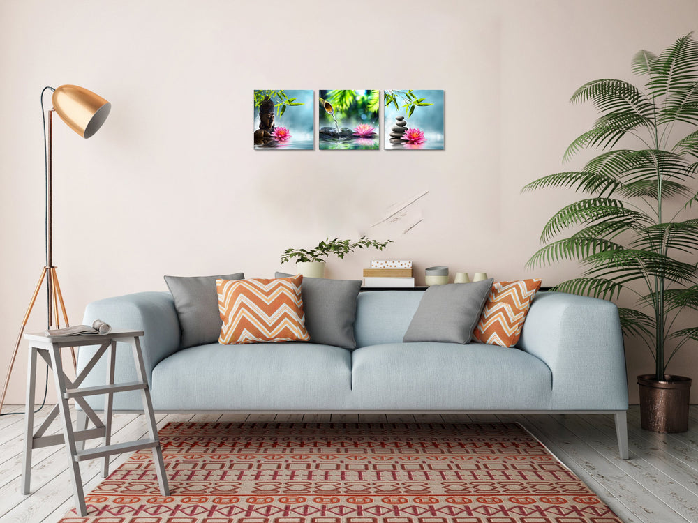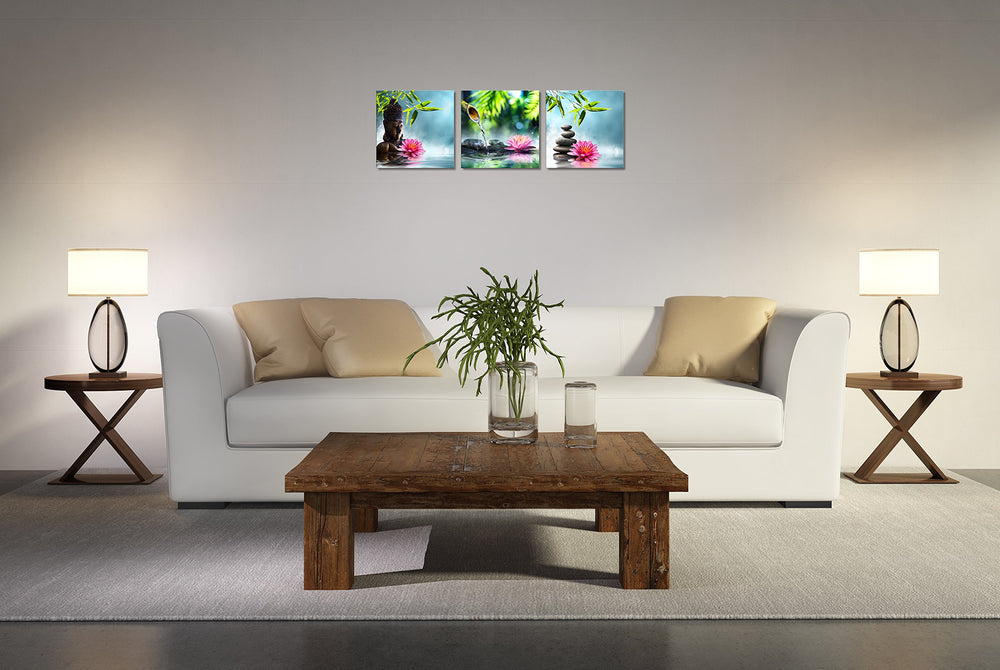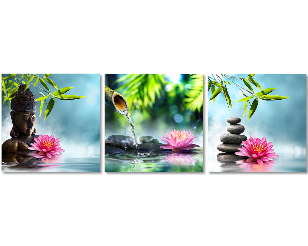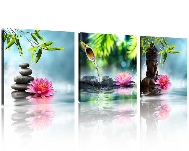 Prints 3 Panel Spa Decoración de pared Spa Stone Green Bamboo Pink Waterlily Zen Buddha Pictures Canvas Painting Print para el hogar y la cocina Estirado y enmarcado Cada panel 12x12 pulgadas
