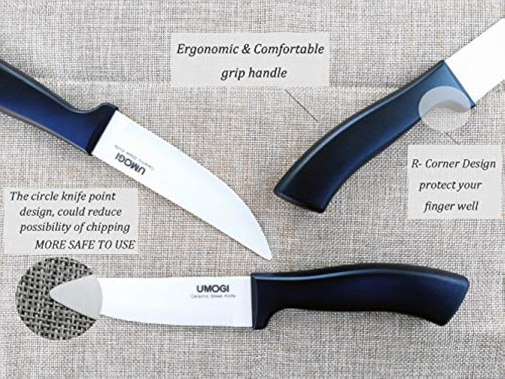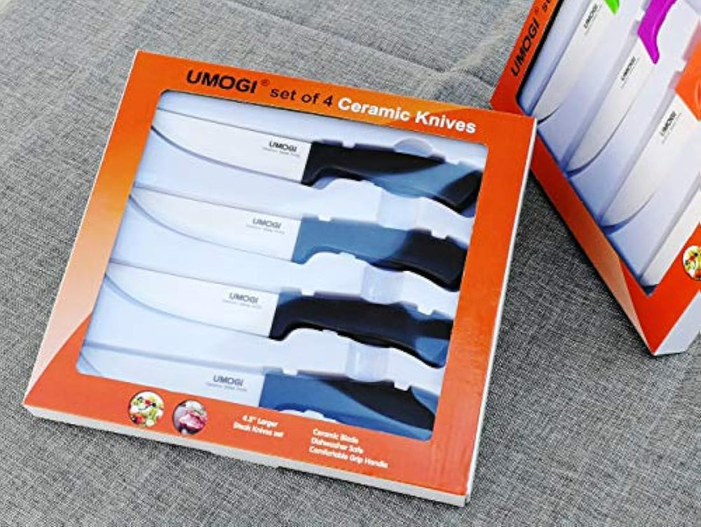*** Características *** .?1, ULTRA-SHARP: El cuchillo de cerámica es uno de los más afilados del mercado y se mantiene afilado durante años. Para cortes finos y precisos. Cuchillo de filete grande de 4.5 pulgadas, no solo para bistec y chuleta de cerdo, sino también para frutas y verduras, barbacoa. Cuchillo para cortar en rodajas, UTILITY KNIFE.?2, HYGIENIC y RUST-PROOF: cuando la carne, las frutas y las verduras se cortan con cerámica, el proceso de oxidación se detiene, lo que significa que sus propiedades se conservan y no se vuelven marrones o en el caja de manzanas, berenjenas, alcachofas, etc. Y la cuchilla de cerámica no cambiará el sabor de la ida. Más higiénico y más seguro que otras cuchillas y no se oxidan.? 3, LIGERO: Debido a que están hechos de cerámica liviana, estos cuchillos son fáciles de manejar y requieren menos esfuerzo.? 4, FÁCIL DE LIMPIAR: La cerámica no absorbe sustancias alimenticias. Simplemente enjuague con agua y seque con una toalla para mantener estos cuchillos en perfectas condiciones. Después de cientos de pruebas estrictas, nuestros cuchillos de cerámica se pueden poner en el lavavajillas. Aunque los cuchillos se pueden lavar con seguridad en el lavavajillas, se r ienda lavarlos a mano. Experimenta la diferencia UMOGI. Si está cansado de buscar ideas para regalos, puede probar este colorido juego de cuchillos para carne. Estilo de moda joven. Este set es un regalo maravilloso para tu esposo, esposa, mamá, papá, abuela y amigos que disfrutan cocinar o er carne. Respaldamos nuestros cuchillos de cena con un 100% de SATISFACCIÓN O DE DEVOLUCIÓN DEL DINERO, pruébelo sin riesgos. EL PAQUETE INCLUYE:  - Tamaño del cuchillo: longitud total 9.0 pulgadas; Cuchilla 4.5 Largo * 1.1 Ancho. - Cuchillos de carne de cerámica de 4 piezas de borde recto con una caja de paquete bien. Mango negro INSTRUCCIONES DE CUIDADO: - Se utiliza para cortar y cortar filetes, carne de cerdo, carne deshuesada, verduras y frutas. - No utilizar sobre superficies de barro, vidrio o porcelana. Evite cualquier choque en la superficie dura. - Limpie sus cuchillos antes de cada uso. Después de cada uso, lavar a mano y secar bien. - No deje los cuchillos en remojo en agua. Reafilar si es necesario con un acero afilador de cerámica.
