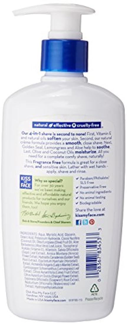*** Características *** KISS MY Face humedad afeitado crema de afeitado, oliva y Aloe sin aroma de jabón de afeitado para piel sensible, 11 oz bombas11 Ounce *** Descripción *** Vitaminas A y E, los nutrientes tan importantes para piel saludable. Contiene una frmula hidratante con antisptico verde menta para fresco y estimular. No contiene ingredientes de animales, colores artificiales, o productos qumicos innecesarios. Para una ms suave, ms experiencia de afeitado nunca
