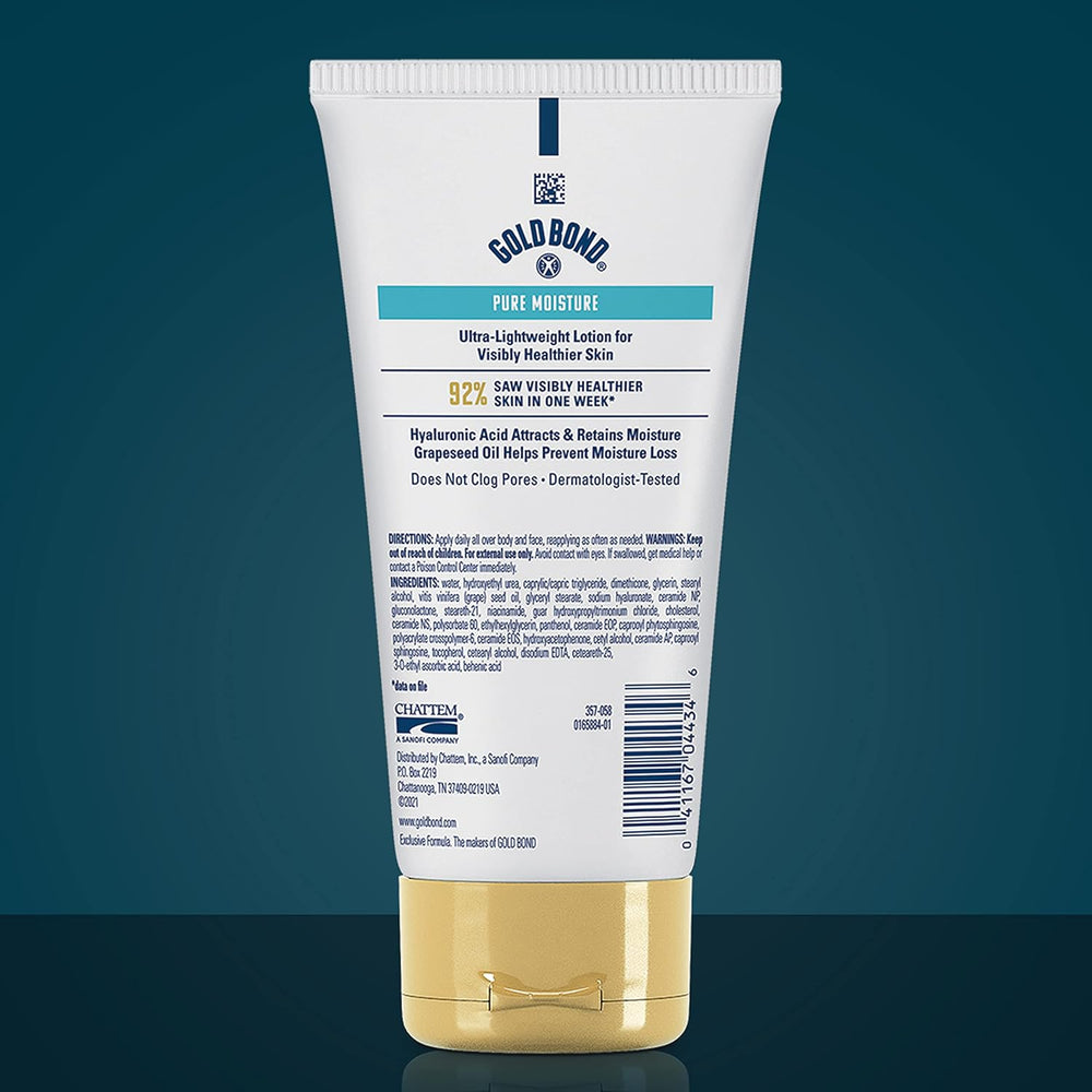 Sobre este artículo Incluye una (1) 5.5 onzas. tube of Gold Bond Pure Moisture Lot loción diaria ultraligera para el cuerpo y la cara Hidratación clínicamente demostrada la para la piel nutrida durante todo el día Fabricado con ácido hialurónico y aceite de semilla de uva de origen natural para ayudar a atraer y retener la humedad y evitar la pérdida de humedad Esta fórmula probada por dermatólogos es hipoalergénica y no obstruye los poros Hidratación ultraligera la libre de parabe tintes y fragancias Crea una cuenta TerraCycle y ienza a reciclar tu embalaje Gold Bond vacío Gold Bond Pure Moisture Lotion proporciona hidratación ultraligera la libre de parabe tintes y fraganc con potentes ingredientes hidratantes que dejarán tu piel con un aspecto más saludable. Se ha demostrado clínicamente que esta loción nutritiva proporciona hidratación inmediata durante 24 ho por lo que puede usarla o una loción diaria para el cuerpo y la cara para mantener la piel hidratada durante todo el día. Formulado exclusivamente con 3 vitaminas y 7 humectan además de ácido hialurónico y aceite de semilla de uva de origen natu Gold Bond Pure Moisture Lotion atrae y retiene la humedad mientras evita la pérdida de humedad. Esta exclusiva fórmula Gold Bond está probada por dermatólogos e hipoalergénica.