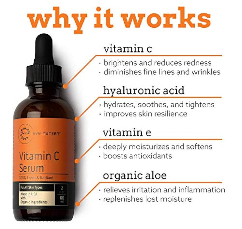 *** Características *** Suero antiarrugas: el suero Vit C aumenta la producción de colágeno y elastina para mantener la piel con un aspecto más joven. Suero facial vegano: el suero de vitamina C reduce las manchas solares, la decoloración y un tratamiento activo de arrugas. regalo para las vacaciones. Regalos de Navidad para mujeres o el mejor regalo de calcetín. Tratamiento de la piel para una piel más brillante, ya que el suero facial antiedad Vit C aclara y refuerza el tono de la piel. , vitamina E y jojoba. Sin sulfatos. Sin parabenos. Sin ftalatos. Tratamiento de suero de piel con vitamina C y cicatriz del acn, tratamiento antienvejecimiento de la piel. Este hidratante srico con vitamina C es clave para aumentar el colgeno, una proteína le da a la piel su firmeza, fuerza. Al aplicar el tratamiento de la piel seca, vitamina c y suero a la piel directamente, los antioxidantes neutralizan los radicales libres que te envejecen. Cuando un radical libre roba un electrn de una de las protenas de un hilo de colgeno, crea una pequeña ruptura en el hilo. Ms roturas = ms arrugas. Dado que la vitamina C es un donante de electrones, ayuda a revertir y prevenir los signos de envejecimiento. salo para mantener la piel firme, juvenil y protegida. El suero de vitamina C de Eve Hansen contiene 20% de vitamina C y 11% de ácido hial junto con otros ingredientes antienvejecimiento para hacer un suero nico para el acné que es rico en antioxidantes que son fácilmente absorbidos por la piel. Funciona bien en todos los tipos de piel, incluyendo pieles sensibles, secas y grasas. Nuestro suero vegano de vitamina C para tu cara se puede utilizar diariamente por la maana, o o un suero nocturno para batir los signos unes del envejecimiento ayuda a reducir las arrugas, líneas finas y manchas oscuras para una tez brillante y una piel de aspecto más joven Para enzar el cuidado de la piel, utilizar un limpiador y tner para lavar y eliminar eficazmente la suciedad, aceites y toxinas de tu piel. Despus de limpiar y tonificar, aplicar sueros faciales o suero lquido de vitamina C, cido hialurnico o retinol. Despus de los sueros, aplique sus cremas, hidratantes o lociones favoritas. El uso de una loción de vitamina C ayuda a mejorar la producción de colágeno. El mejor suero de vitamina C acta o un suero aclarante facial, suero de tensión, suero de acn, y su capacidad para reducir arrugas, líneas finas, manchas oscuras, manchas solares, encoger los poros, irritación de quemaduras solares, manchas de edad y equilibrar el cuidado del tono de la piel. El suero orgánico de vitamina C ayuda a reparar la aparicina del dao solar. Regalos para mam regalos para mujeres Da de la Madre regalos Da de la Madre ideas de regalo mam set de regalo de Da de la Madre regalo