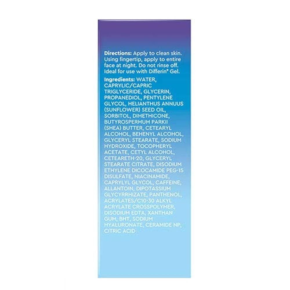 Características Fórmula hidratante con ácido hialurónico, ceramidas y alantoína para mejorar visiblemente la textura de la piel hidratando la piel seca durante la noche. El ácido hialurónico se encuentra de forma natural en la piel y se une al agua para ayudar a retener la humedad natural y mantener la piel con aspecto mullido. Las ceramidas ayudan a mantener y restaurar la barrera de la piel para bloquear la humedad durante 24 horas. Alantoína calma la piel seca y escamosa. Fórmula desarrollada y probada por dermatólogos que no es irritante, sin fragancia y no edogénica.