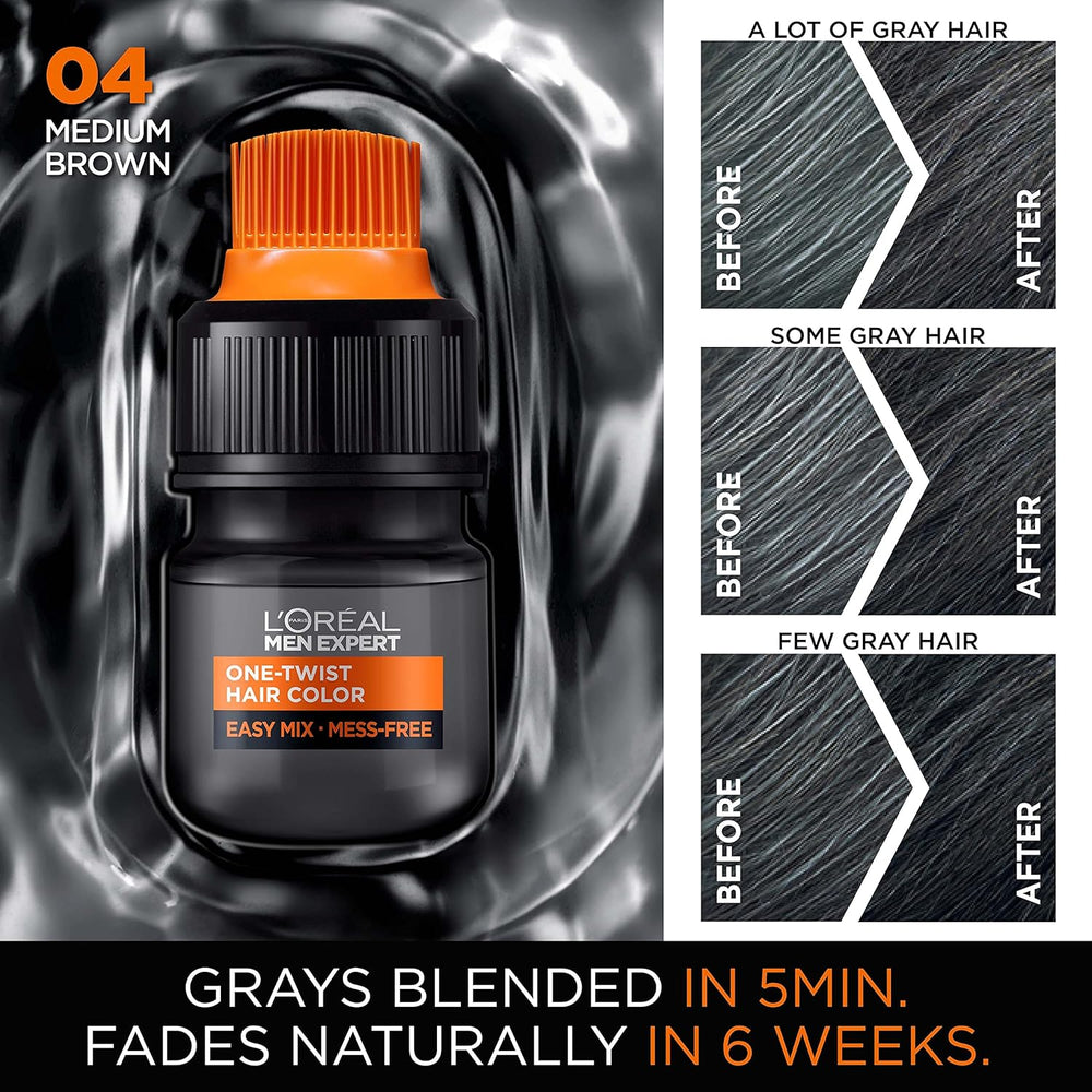 Color 04 Marrón Medio H35 Información del paquete Botella Beneficios del producto Tinte de pelo L'Oréal París Formulario de artículo Líquido Acerca de este artículo Desarrollado específicamente para homb este color de cabello para cobertura de canas cubre las canas en 5 minutos. Nunca ha sido tan fácil cubrir tus canas. Resultados simplemente naturales desde la raíz hasta las puntas. El kit incluye 1 aplicación. Aplicación fácil y sin licaciones: nuestro tinte para el cabello L'Oreal Men Expert se entrega en un aplicador patentado ONE TWIST. Simplemente g ag agriete y aplique. ina las canas con tu color de cabello original y se desvanece naturalmente en 6 semanas. Aspecto natural y duradero: el 95 de los hombres coinciden en que su cabello se siente suave y luce más saludable después de su uso. Funciona en todos los niveles de canas y todo tipo y textura de cabello. No se lava y dura hasta el próximo corte de cabello. L'Oreal ha creado una colección de 8 tonos de color de cabello para hombres de aspecto natu que van desde el rubio oscuro hasta el negro azabache. Un color de cabello permanente y sin amoníaco que apunta a la cobertura de canas