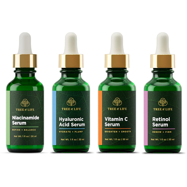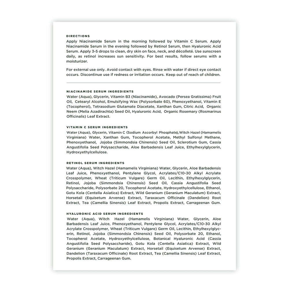 Piel sedosa y l en cuatro sueros simples. El suero de niacinamida ayuda a minimizar los po aclarar la piel y mejorar su tono general. El suero de ácido hialurónico ayuda a hidra suavizar y rellenar. El suero de retinol reduce la apariencia de líneas finas y arrugas y desvanece el aspecto de las manchas de la edad. La vitamina C ayuda a iluminar y suavizar la piel. Todo son libres de cruel dermatológicamente probados y hechos para todos los tipos de piel y tonos. Ade están repletos de ingredientes cuidadosamente elegidos con los que puedes sentirte bien. Instrucciones: Aplicar suero de niacinamida por la mañana seguido de suero de vitamina C. Aplica el suero de niacinamida por la noche seguido por el suero de reti luego el suero de ácido hialurónico. Aplica de 3 a 5 gotas sobre la piel limpia y seca en la c el cuello y el escote. Usa protector solar diariame ya que el retinol aumenta la sensibilidad solar. Para obtener los mejores resulta sigue los sueros con una crema hidratante.