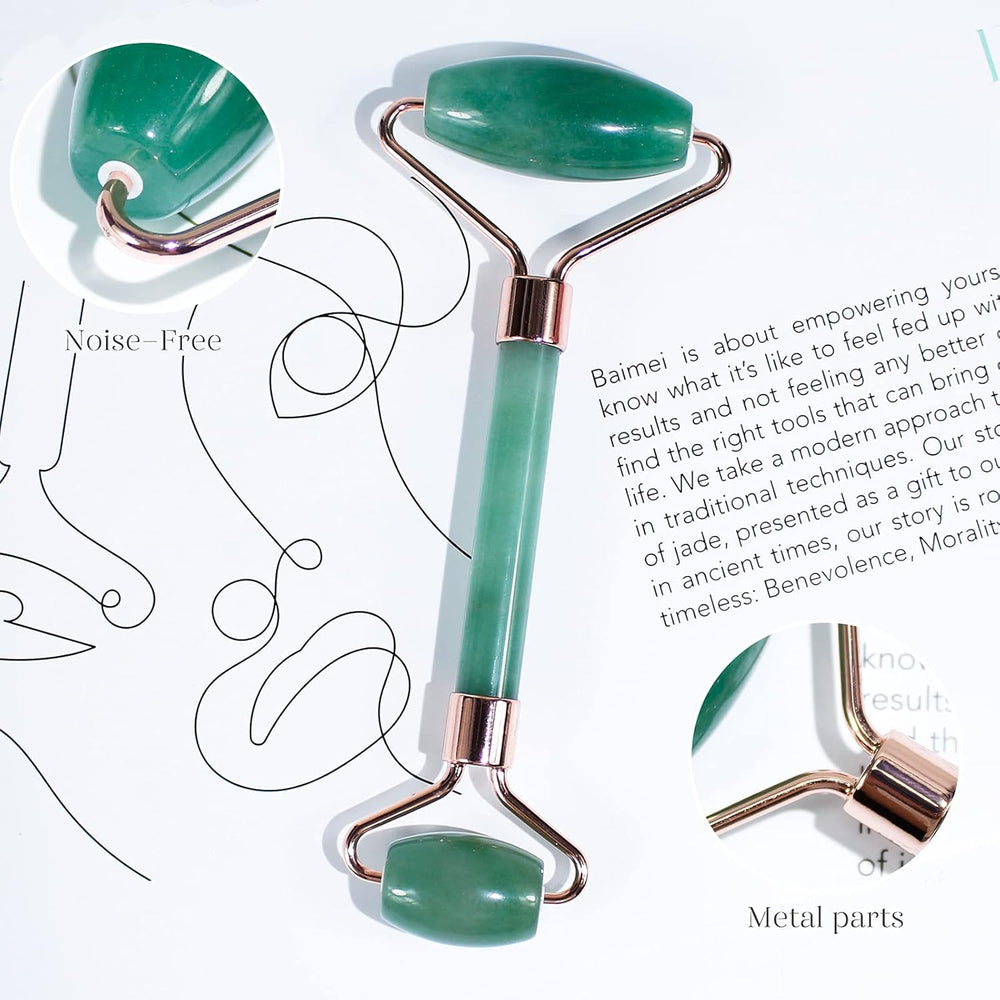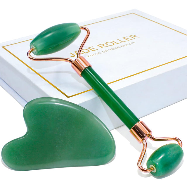 Sobre este articulo BENEFICIOS: El rodillo de cara y guasha está hecho de piedra aventurina verde. Ayuda a que tu piel se vea fre reafirma tu piel y hace que se vea hidratada y levant estimula la circulación y relaja los músculos faciales. Jade Face Roller: Es resistente y no chirría. Hay una parte de unión de silicona entre el rodillo y las partes metáli por lo que el rodillo es muy suave para rodar sobre la piel. Refresca y energiza la piel. Gua Sha: no solo puede levantar la piel y mejorar las líneas finas con presión hacia arr sino que también ayuda a moldear la línea de la mandíbula Consejos: puede guardarlos en el refrigerador y ayuda a erradicar la hinchazón de la mañana y refresca la piel. Aplica la herramienta masajeadora “antienvejecimiento” con tu aceite facial y mascarilla de lám y verás el efecto en tu piel. La herramienta de belleza merece una oportunidad.