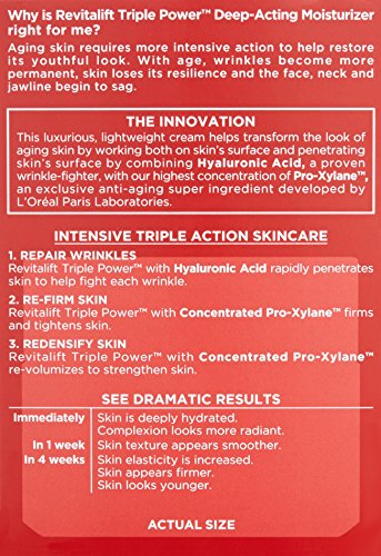 CARACTERISTICA CREMA DE DÍA ANTI-ENVEJECIMIENTO: esta crema hidratante antienvejecimiento aborda múltiples signos de envejecimiento de la piel en solo 1 semana: reduce las arrugas, reafirma los contornos, ilumina la piel, suaviza la aspereza de la piel e hidrata profundamente para una piel más joven. INGREDIENTES POTENTES: Formulado con 3 de los mejores ingredientes r endados por la derm: Pro-Retinol, Ácido Hialurónico y Vitamina C. El Pro Retinol reduce las arrugas y reafirma la piel. El ácido hialurónico hidrata y rellena la piel. La vitamina C aumenta la luminosidad e iguala el tono. REHABILICE LA HIDRATACIÓN CON HIDRATANTE FACIAL: regale a su piel una dosis diaria de hidratación del cuidado antiarrugas Revitalift para proporcionarle a su piel la humedad esencial para mantener la piel hidratada y saludable. HIDRATANTE PARA EL USO CADA DÍA: aplica esta crema intensiva sobre la cara y el cuello hasta que se absorba pletamente. Úselo solo en la mañana o en la tarde o parte de su rutina diaria de cuidado de la piel o capa según sea necesario. Debido a que esta crema hidratante suaviza visiblemente la textura de la piel, se usa bien debajo del maquillaje y se puede usar o imprimación. El empaque y la fórmula pueden variar. Recientemente, mejoramos nuestra fórmula con nuevos ingredientes, una nueva fragancia, una nueva textura y agregamos mejores resultados. Siempre lea la lista de ingredientes en la etiqueta del producto antes de usar.