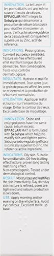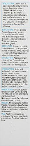DESCRIPCIÓN Hidratante facial sin aceite para pieles grasas. Effalcar Mat tiene tecnología Sebulyse para apuntar el exceso de aceite para una doble acción: matificar la piel y refinar los poros, al tiempo que proporciona hidratación diaria. Excelente base para maquillaje. Premios: Fitness Best Awards, 2013; Todas las mejores pras de belleza, 2013 Beneficios La crema hidratante es libre de aceite y no edogénica con un acabado mate claro. Esta crema hidratante cierra visiblemente los poros. USO SUGERIDO Úselo o humectante matificante diario sin aceite para pieles grasas después de la limpieza. Es una excelente base para el maquillaje.