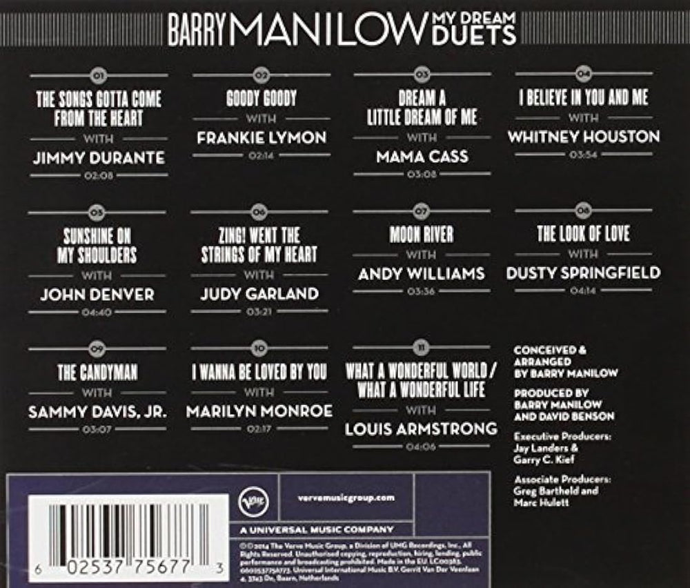*** Características *** Para su debut en Verve Music, MY DREAM DUETS, Manilow demuestra que es un fan que celebra a sus propios héroes musicales que lo han inspirado a lo largo de los años. Desde ídolos queridos como Judy Garland y Louis Armstrong hasta íconos contemporáneos como Whitney Houston y John Denver. Barry se ha unido a ellos en su estudio de grabación, emergiendo con una colección de notables clásicos a dúo. Aunque los artistas invitados extraordinarios de MY DREAM DUETS ya no están con nosotros, la misión de Manilow es asegurar que sus voces inmortales sigan viva para emocionar y entretener a todas las generaciones de amantes de la música.