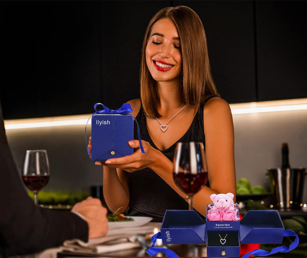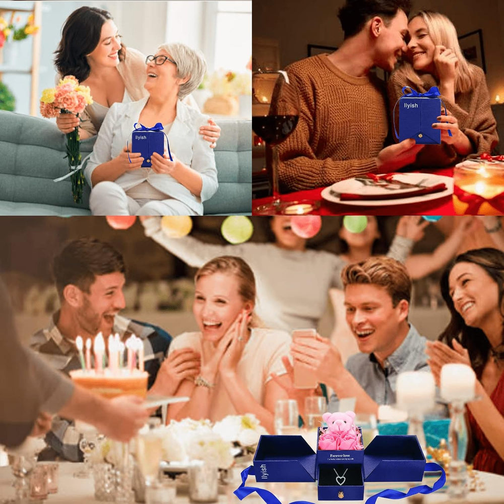 ? Regalos románticos para mujeres: este es un regalo romántico para muje mad nov esposas en cumplea día de la ma día de San Valen aniversar que no quieren recibir un regalo único. ? Collar para mujer: collar de rosas preservadas con cora chapado en pl oro r 14 quila hipoalergén sin pl sin níq inofensivo para la sa colgante en forma de corazón que representa el amor ete sim elegante y versátil es tu mejor opción. Hermosa caja de regalo y bonito oso: utilizamos bonitos osos para decoración. Los osos pequeños son cómodos al ta lo que significa un cuidado meticuloso y protección de tu amor. Joyero estilo ca que puede contener jo lápiz lab etc. La flor eterna se bina con el oso para darte una espera suave. ? Símbolo de amor: una flor es ete solo el amor es ete las flores preservadas y los collares de corazón representan el amor ete el amor doble la hace más a gu más profundo que el amor es a y más importante que el amor eres tú.