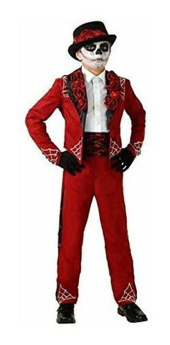 Caracteristicas: 100% poliéster Tamaño: Pequeño (6) Disfraz del día de los muertos para niño Satén 100% poliéster, gamuza sintética y encaje Chaqueta de gamuza sintética con solapa de satén negro y rosas de tela roja Botones decorativos en cintura y mangas, patrones decorativos de tela de araña en chaqueta y pantalón.