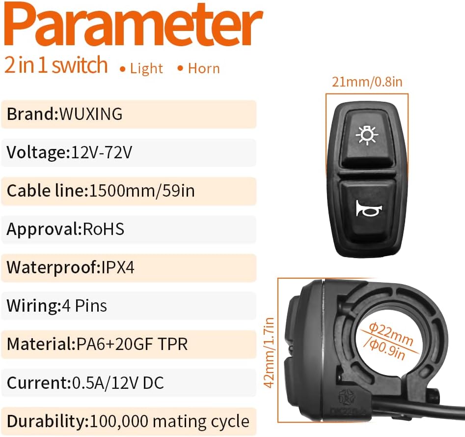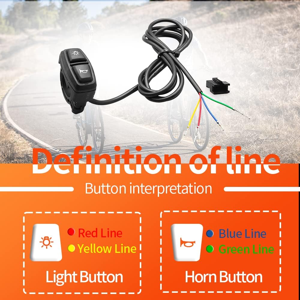 Acerca de este artí La longitud del cable DK226 es: 1500 mm (59 pulgad la longitud del cable DK11 es: 1600 mm (63 pulgadas) Es ligero y perfecto para otros accesor ya que es pacto. Ideal para cualquier bicicleta de ca motocicl bicicleta eléctrica y mucho más. Adecuado par el diámetro del manillar es de 24 adecuado para la mayoría de bicicletas eléctri bicicletas de mont quads y otros vehí s; Puede controlar el interruptor d el interruptor de la bocina. Dos botones con iconos en el operación simple y cl fácil de dominar y usar Utilizamos el almacén d su paquete será entregado a través del almacén más cerc para que reciba sus productos más rápido ? Ver más detalles del producto Detalles de DK11: : WUXING Tipo: Botón de interruptor DK-11 Enchufe: 4 pines Longitud del cable: 1600mm 63in Corriente: 3A 12V DC Color: Negro Peso: 68g Definición de la línea DK11: Luz: Línea roja y línea amarilla Bocina: Línea azul y línea verde Detalles de DK226: : WUXING Voltaje: 12V-72V Línea de cable: 1500mm 59in Aprobación: RoHS Enchufe: 4 pines Material: PA6+ 20GF TPR Corriente: 0.5A 12V DC Durabilidad: 100,000 ciclos de acoplamiento Definición de la línea DK226: Luz: Línea roja y línea amarilla Bocina: Línea azul y línea verde