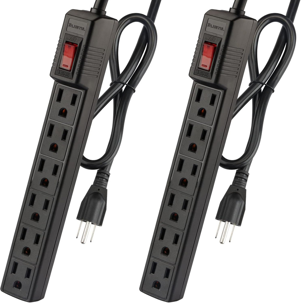 PLUGTUL Paquete de 2 protectores de sobretensiones con 6 tomas de corriente y cable de extensión de 2 pies, 1875 W/15 A, 90 julios, protección contra sobrecargas y sobretensiones, soporte de pared