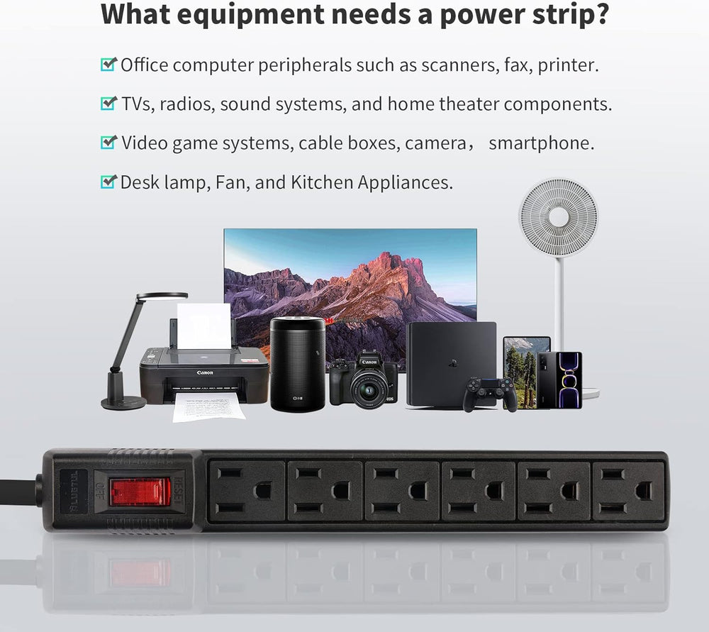Sobre este artí Tira de alimentación de 6 tomas: paquete de 2 regletas de 6 enchufes con cables de extensión 14AWG de 2 pies (1875 W 15 protector de sobretensiones (90 julios) con protección contra sobrecarga para proteger tus dispositivo s de sobreca cortocircu picos de ener golpes de rayo o fluctuacio perfecto para tu ho ofic garaje y cualquier lugar donde múltiples dispositivos necesiten energía. Material ignífugo: tira de alimentación de 15 A fabricada con carcasa ignífug clase d lo que te mantiene a ti y a tus dispositivos pletamente seguros; +s de cobre moldeados de una sola pieza para una mejor conductividad y seguridad. Seguridad y certificado: listad esta regleta tiene protección contra sobreca protección contra cortocircui protección contra sobrecorrie protección contra sobretensión y protección contra sobrecalentamiento. Los circuitos inteligentes con detección de voltaje incorporada detectan la potencia act cuando se excede la potencia nomi el interruptor se apagará automáticamente para mantener su dispositivo seguro. Montaje en pared: esta regleta de alimentación montada en la pared se puede instalar firmemente en la pa debajo del banco de trabajo a través de las 2 ranuras en la parte poster optimizando racionalmente el espacio del escritorio. (con 2 tornillos) Lo que obtienes: paquete de 2 protectores contra sobretensiones PLUGTUL (idioma español no garantiza guía de bienve de 30 d nuestro servicio a confiable de 24 meses sin preocupaciones te responderá e .