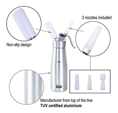 Una marca europea de confianza con más de 15 años de experiencia en utensilios para hornear, ICO's es el único dispensador de crema batida que tiene más de 15 años de historia de ventas en Europa, Estados Unidos, Canadá, México, Centroamérica e Israel. Confíe en la calidad de nuestro producto a nuestra experiencia. Otros vendedores líderes de solo han estado vendiendo este producto desde 2015. Calidad profesional: clasificado por America's Test Kitchen como el mejor dispensador de crema batida por menos de $ 30. Los únicos artículos mejor calificados fueron el Mosa Professional ($ 69.00) y el ISI Gourmet Whip ($ 99.27). Hay un enlace a la revisión en PDF en el área de descripción a continuación.