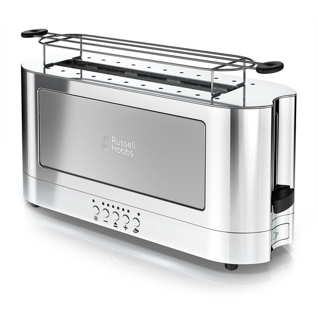 *** Características *** * Tostadora larga: el diseño extendido ocupa un lugar estrecho en su encimera, lo que permite tostar fácilmente cortes largos de pan y tostar lado a lado las rebanadas más pequeñas. * Parrilla de calentamiento extraíble: esta parrilla de alambre se adhiere a la parte superior de la tostadora, lo que permite calentar fácilmente bollos, pasteles y rollos. Retirar para tostar regularmente. * Levante y mire: controle el progreso del tostado sin cancelar el ciclo de calentamiento. * Tres funciones: la función Bagel tuesta el lado cortado y calienta el lado inferior de los bagels. El ajuste Congelado ajusta el tostado para lograr resultados idénticos al pan fresco. Cancelar termina el tostado. * Control de dorado variable: seleccione el nivel de cocción que prefiera, de 1 (claro) a 6 (oscuro).