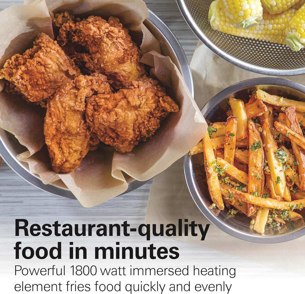 Nombre del modelo Freidora eléctrica de estilo profesio tapa Hamilton Beach Material Acero inoxidable Color Dos cestas para fr acero inoxidable Dimensiones del producto 21,4"prof. x 14,1"an. x 10,2"al. pulgadas Peso del artículo 12,4 Libras Potencia vatios Capacidad de aceite 4,5 Litros GRAN CAPACIDAD DE ACEITE DE 4.7 QUART (19 CUP) LE PERMITE FRITAR HASTA 12 TAZAS DE ALIMENTOS: Prepare todos sus alimentos favoritos a la vez con esta freidora de gran capaci desde papas fritas y tiernos de pollo hasta verduras rebozadas y mariscos. Freír sin salpicaduras: Preparar alimentos crujientes y deliciosos en una freidora eléctrica no solo es más fácil que usar una olla en la est sino que es menos desordenado. La tapa ventilada evita salpicaduras desordenadas mientras coci y la ventana te permite ver la da mientras se cocina. 2 cestas para mayor versatilidad: freír 1 o 2 alimentos al mismo tiempo con las dos cestas de freír de 6 tazas. Después de fr las cestas cromadas se enganchan sobre la olla de aceite para que puedas drenar el exceso de aceite. Fácil de montar y limpiar: armar la freidora es tan fácil desmontarla. Después de fr la olla de aceite recubierta de esma las cestas y la tapa van en el lavavajillas para una fácil limpieza. COMIDA DE CALIDAD RESTAURANTE EN MINUTOS. El potente elemento calefactor sumergido de vatios fríe los alimentos de forma rápida y unifo por lo que puedes preparar de manera experta todas tus recetas favoritas fritas en la didad de tu propia cocina.