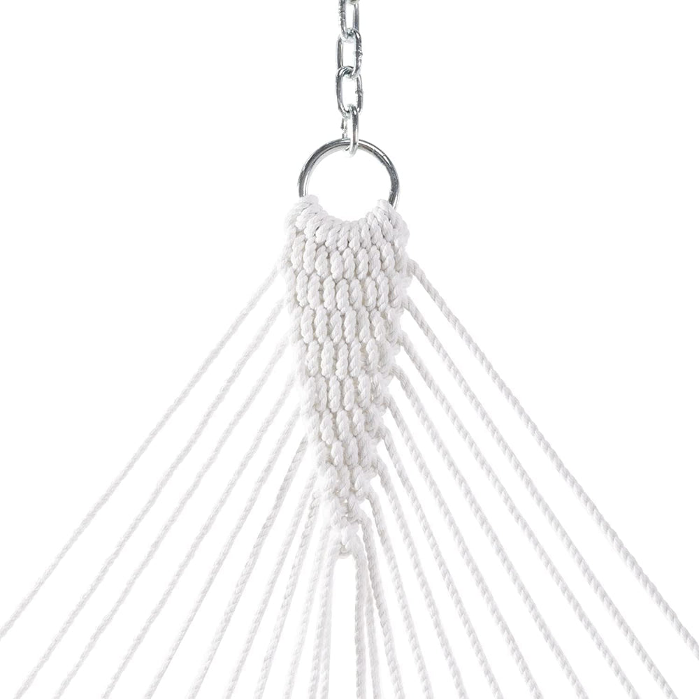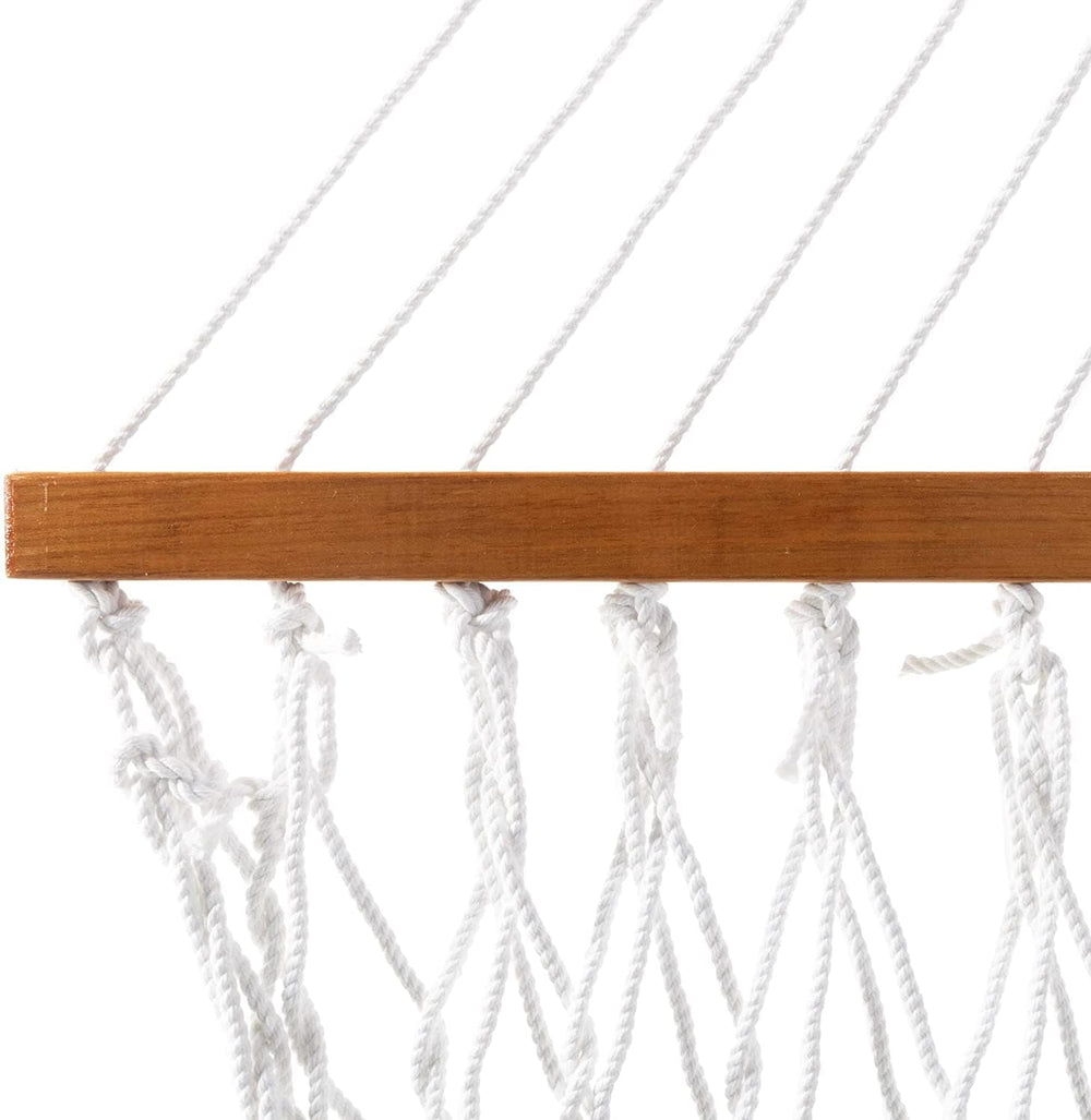Acerca de este artí [CUERDA DURACORD]: Mezcla sintética suave o el algodón con la durabilidad del poliéster. Esta cuerda es resistente a todas las condiciones climáticas y a impurezas. DURACORD es la cuerda más densa en el merc lo que resulta en menos estiramiento y mayo al relajarse. [BARRA DE DIFUSIÓN DE ROBLE]: Roble premium que ha sido sumergido repetidamente a mano en un barniz de grado marino color miel para protección y longevidad. [TEJIDO DE DOBLE ENCADENAMIENTO]: Las cuerdas individuales están tejidas a mano para tirar unas contra otras y producir un diseño en forma de celo eliminando la necesidad de nudos dentro de la cama de cuerda. Esto también nos permite usar casi el doble de cantidad de cuerda en cada hamaca que la mayoría de nuestros petidores. [HARDWARE GALVANIZADO]: Galvanizamos todo nuestro hardware con zinc para protegerlo contra el óxido una vida útil más larga en exteriores. [HECHO A MANO EN LAS CAROLINAS]: Ensamblado utilizando las mejores piezas y técnicas líderes en la industria. ? Ver más detalles del producto Información del producto Color Blanco Original Pawleys Island Dimensiones del producto 156"L x 55"W Capacidad de asientos 2.0 UPC 096355534840 Fabricante Original Pawleys Island Peso del artí 14.85 libras ASI 9PSP5GZ8 Opiniones de lo s 4.7 de 5 estrellas 787 valoraciones Ranking de los más vendidos number 41,829 en Pa Jardín y Exteriores (Ver los 100 mejores en Pa Jardín y Exteriores) number 89 en Hamacas del producto: Para obtener información sobre l de este prod ¿Te gustaría contarnos sobre un precio más bajo?