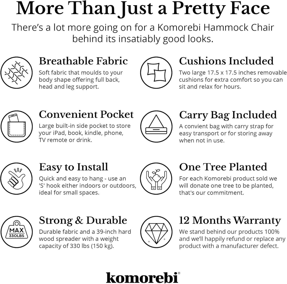 Acerca de este artí 65 Algo 35 Poliéster TELA SUAVE Y TRANSPIRABLE - Hermoso columpio colgante de hamaca inspirado en estilo boho. Diseñado para ofrecer u pleto para la espalda al adaptarse perfectamente a tu cuerpo y aliviar la tensión espinal que ocurre en la mayoría de los d permitiéndote sentarte y relajarte verdaderamente durante horas. BOLSILLO LATERAL INCORPORADO - Los libros nos transportan a otro mundo. Un columpio colgante es el mejor lugar para leer en la casa. Proporciona suficiente privacidad y tiene un bolsillo lateral donde puedes guardar tu libro hasta tu próxima sesión de lectura. COJINES GRANDES INCLUIDOS - Viene con dos cojines extra grandes para mayor odidad y sopo y una bolsa de transporte con correa para un fácil transporte y almacenamiento. Cada cojín mide 17.5 x 17.5 pulgadas (45 cm x 45 cm). FUERTE Y DURADERO - Debido a su resistente tela de lona de poliéster algodón con capacidad de peso de 330 libras (15 pued odar a 1 adulto con un niño a la vez; la resistente barra de madera de 39 pulgadas mantiene la hamaca abie permitiendo un uso más fácil para entrar y salir. FÁCIL DE INSTALAR EN INTERIORES O EXTERIORES - Estas funcionales sillas colgantes para dormitorios funcionan muy bien en entornos tanto interiores o exterio incluidos espacios pequeños. Puedes usarlo en la habitación de tus hijos o adolescen apartamento o uni pa debajo de un ár en el patio tras en la pl acampando y más. DE 12 MESES - Todos los productos de Komorebi vienen con un del Fabricante de 12 Meses y están garantizados para estar libres de defectos en materiales y mano de obra. Cambiaremos con gusto cualquier producto con un defecto de fabricación dentro de los 12 meses de la pra original. ? Ver más detalles del producto Información del producto Dimensiones del producto: 59 x 47 x 56 pulgadas Peso del artí : 6 libras Fabricante: KOMOREBI 7T3DDRJ2 País de origen: China Número de modelo del artí : Gris Valoraciones de lo s: 4.5 de 5 estrel 964 valoraciones Descripción detallada: - Silla hamaca KOMOREBI de 60" x 47" con columpio de cuerda para uso en interiores y exteriores - Fabricada con lienzo de algodón suave y duradero - Incluye 2 cojines grandes de macramé - Ideal para habitacio patios y porches Tipo de tela: 65 algo 35 poliéster Descripción de l : 12 meses Baterías requeridas: No Este producto se encuentra en el puesto 75,398 en la categoría de Pa Jardín y Exterio y en el puesto 155 en la categoría de Sillas Columpio. ¡Descubre más sobre este producto y sus características!