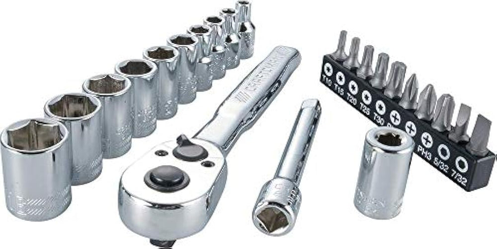 *** Características *** Marcar grandes para una identificación rápida del enchufe.72 trinquetes de dientes para un columpio mínimo del arco Acabado cromado pulido para resistencia a la corrosión. Conector de 6 puntos para mayor par de torsión con cierre y durabilidad. pleta, consulte la sección " y Soporte" a continuación para obtener detalles pletos. El 24pc 1/4-in. El juego de herramientas mecánicas de accionamiento viene equipado con un trinquete de 72 dientes, una amplia variedad de herramientas de accionamiento y una caja de almacenamiento pacta. Este conjunto es perfecto para reparaciones automotrices, construcción general y reparaciones de bricolaje.
