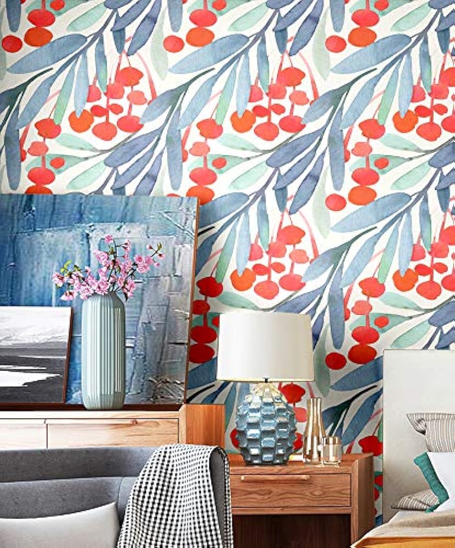 Material Pelar y pegar con revestimiento de vinilo Marca Blooming Wall Estilo Hojas verdes azules con cerezas rojas Cobertura 14.5 square feet Tema Botanical Sobre este artículo Patrón/material: papel pintado de pared con hojas verdes y azules con cerezas rojas, autoadhesivo. Fácil de aplicar, simplemente despegar y pegar. ???Tamaño?Cada rollo es de 17.7 in de ancho x 98.4 ft; cubre 14,5 pies cuadrados