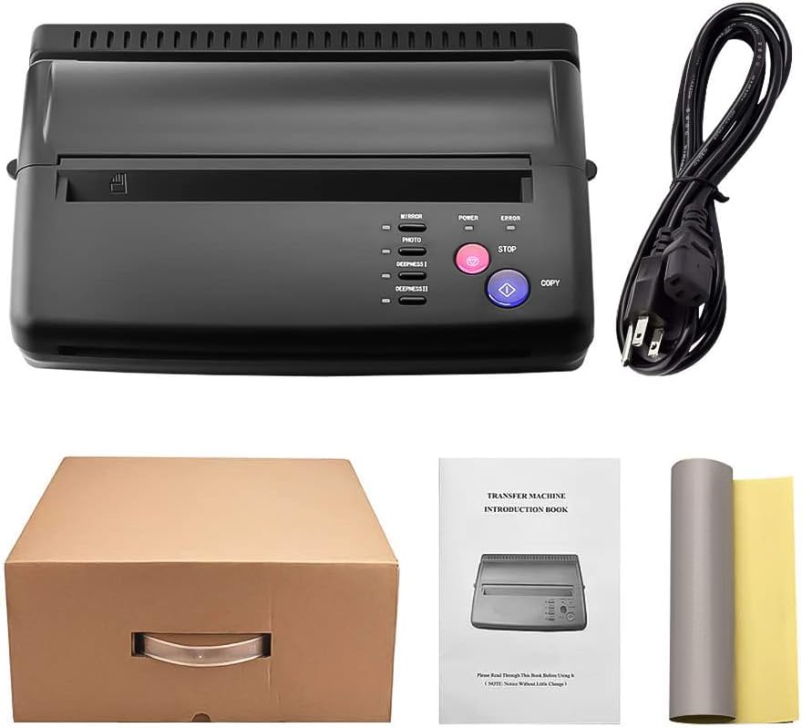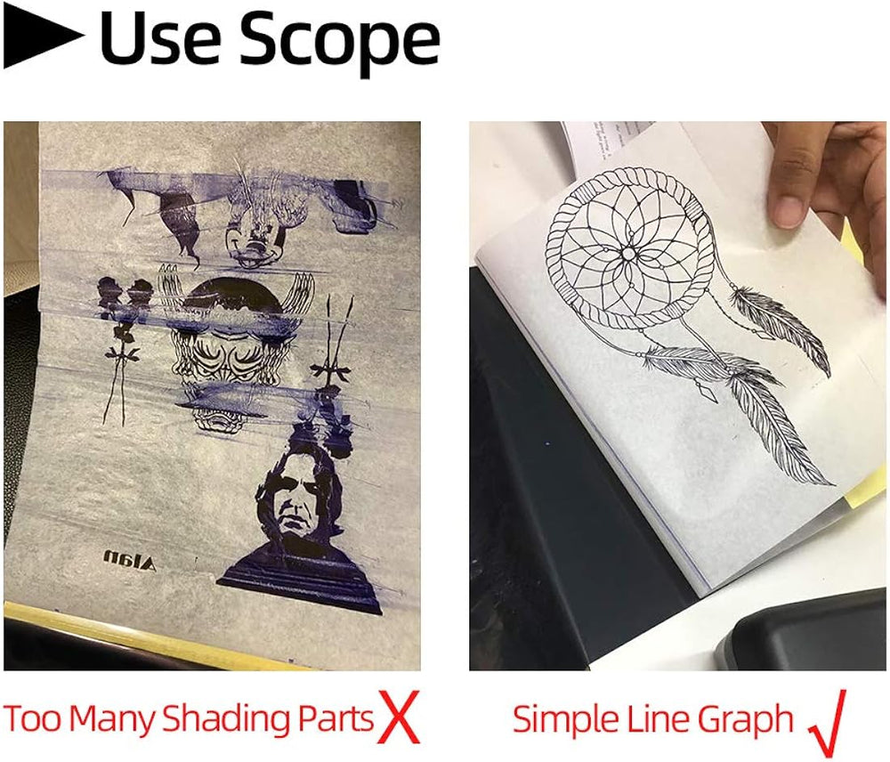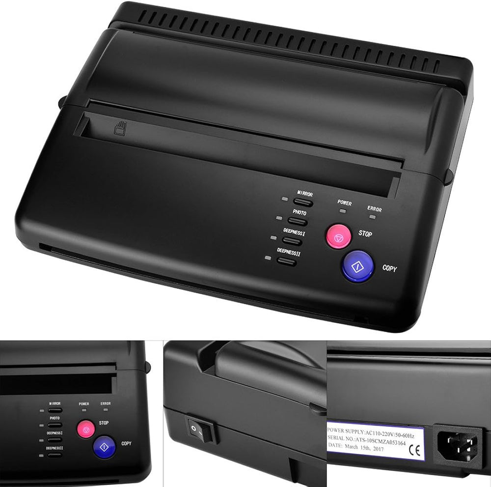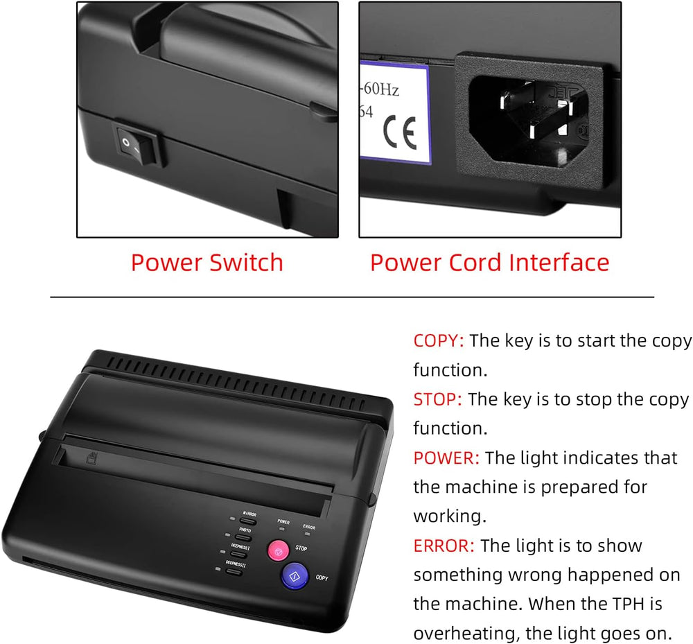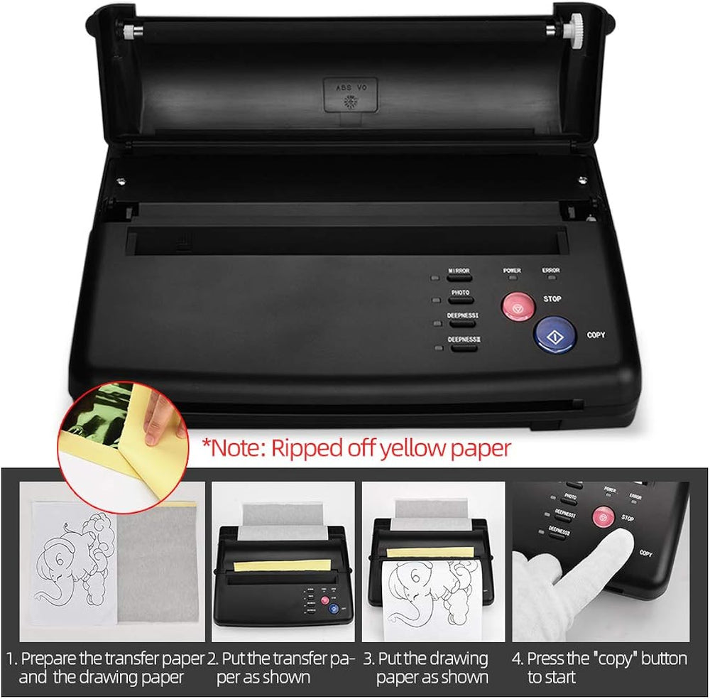 Copie el diseño en los papeles de transferencia fácil y rápidamente. Esta impresora de tatuajes tiene una velocidad de impresión de transferencia ráp bajo ca bajo nivel de ruido y rendimiento able. El paquete incluye 1 copiadora térmica de tatua 1 cable de fuente de alimentación y el libro de instrucciones (idioma español no garantizado). Para un mejor efecto de transferen la máquina debe descansar durante unos minutos después de la transferencia de 1-2 hojas. Se puede utilizar solo para transferir gráficos de lín no se puede utilizar con patrones con muchas piezas de sombreado.