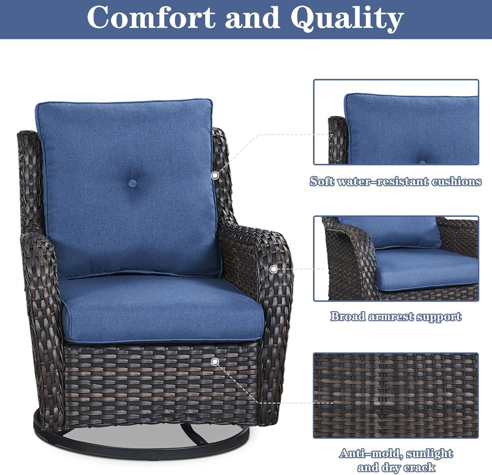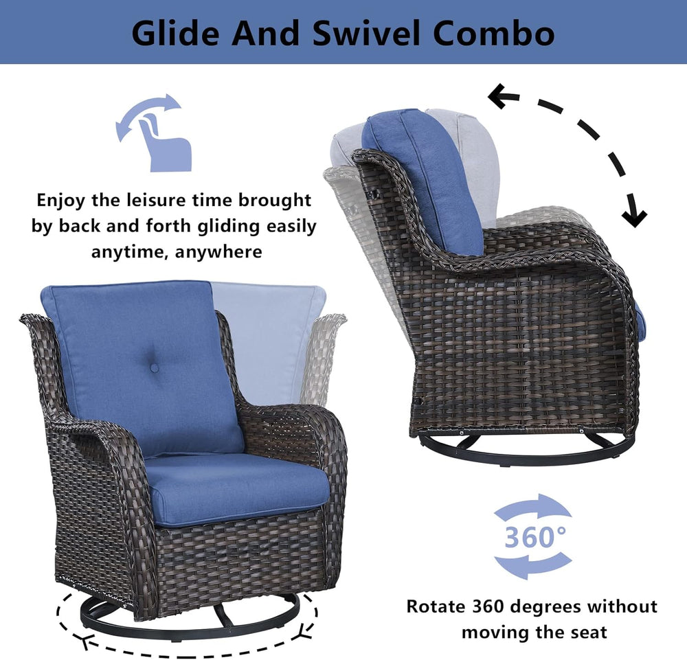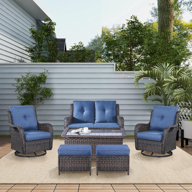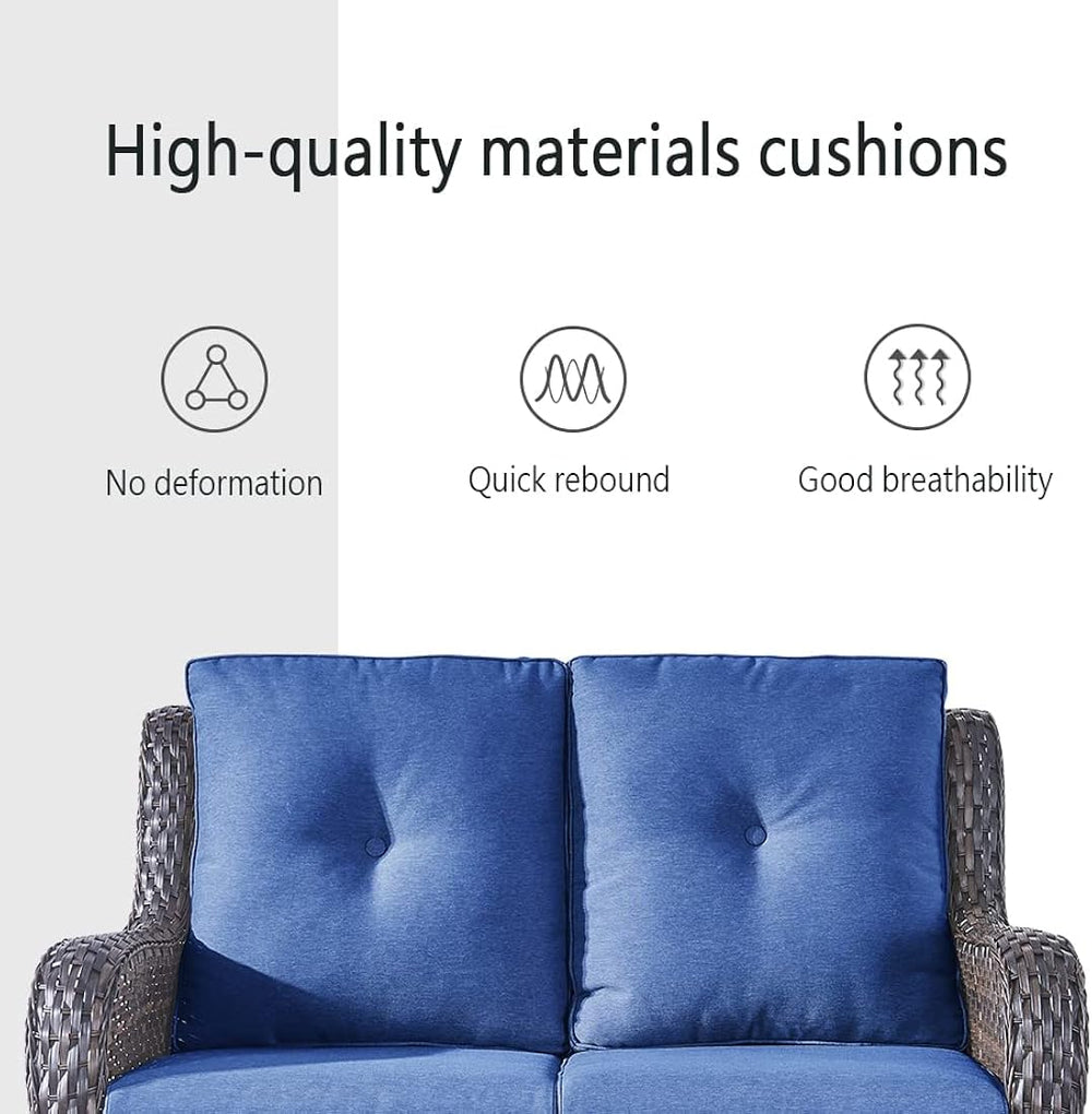 Belord Juego de muebles de mimbre para exteriores, juego de muebles de patio de 6 piezas con sillas mecedoras giratorias, sofá biplaza, otomanas y mesa auxiliar, cojín azul