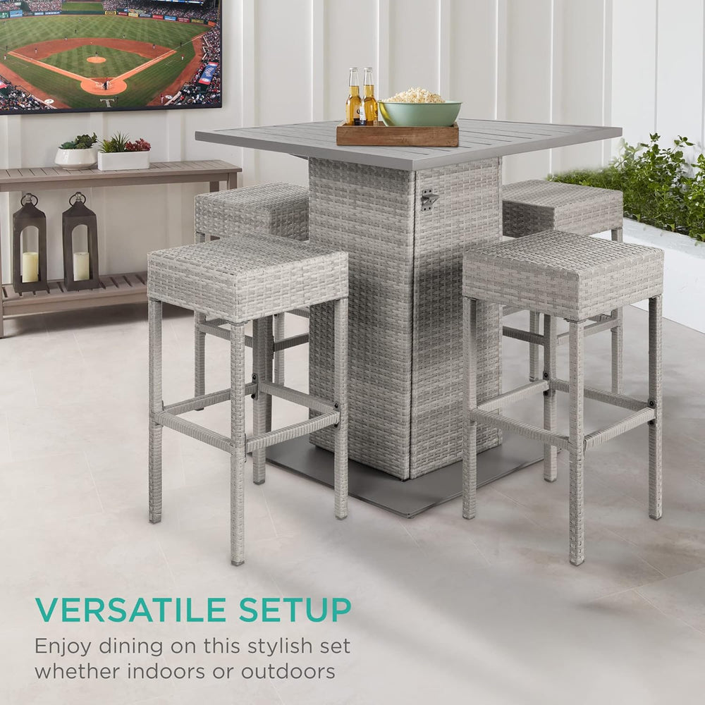 Best Choice Products Juego de mesa de mimbre de 5 piezas para patio, piscina, patio trasero con abridor de botellas integrado, estante de almacenamiento oculto, mesa de metal, 4 taburetes, color gris