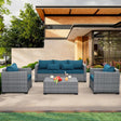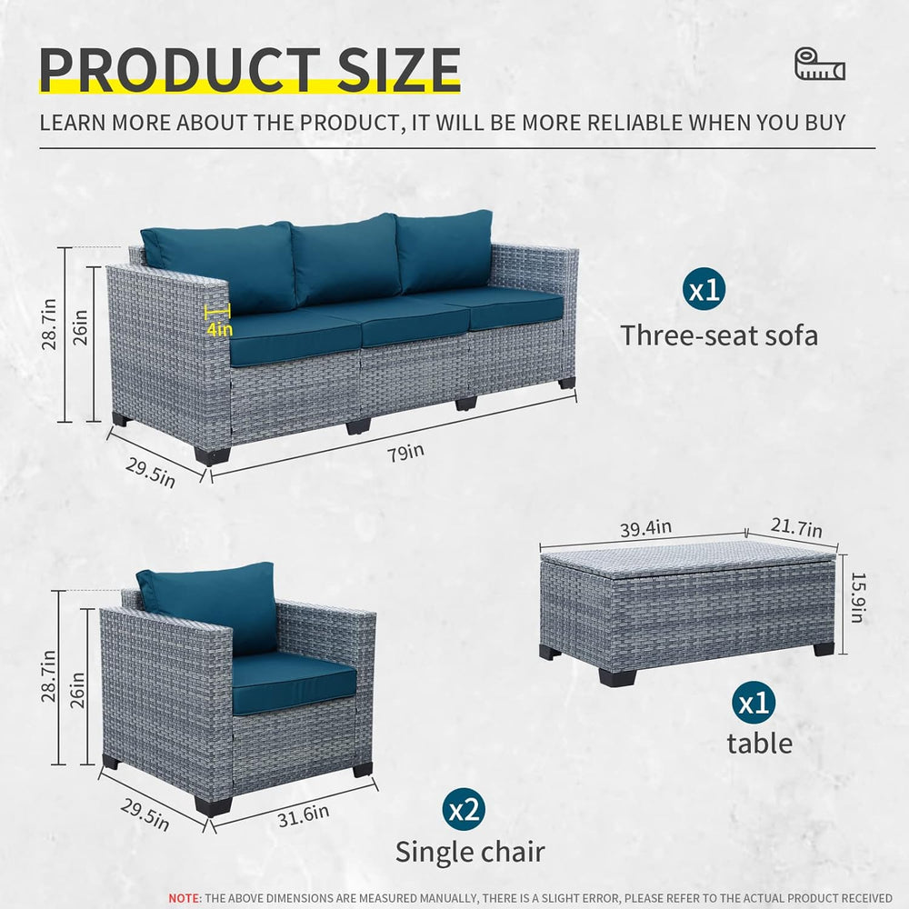 Lviden Juego de muebles de mimbre para patio de 4 piezas, juego de conversación al aire libre, sofá seccional de ratán de polietileno con mesa de almacenamiento y cojines azul pavo real