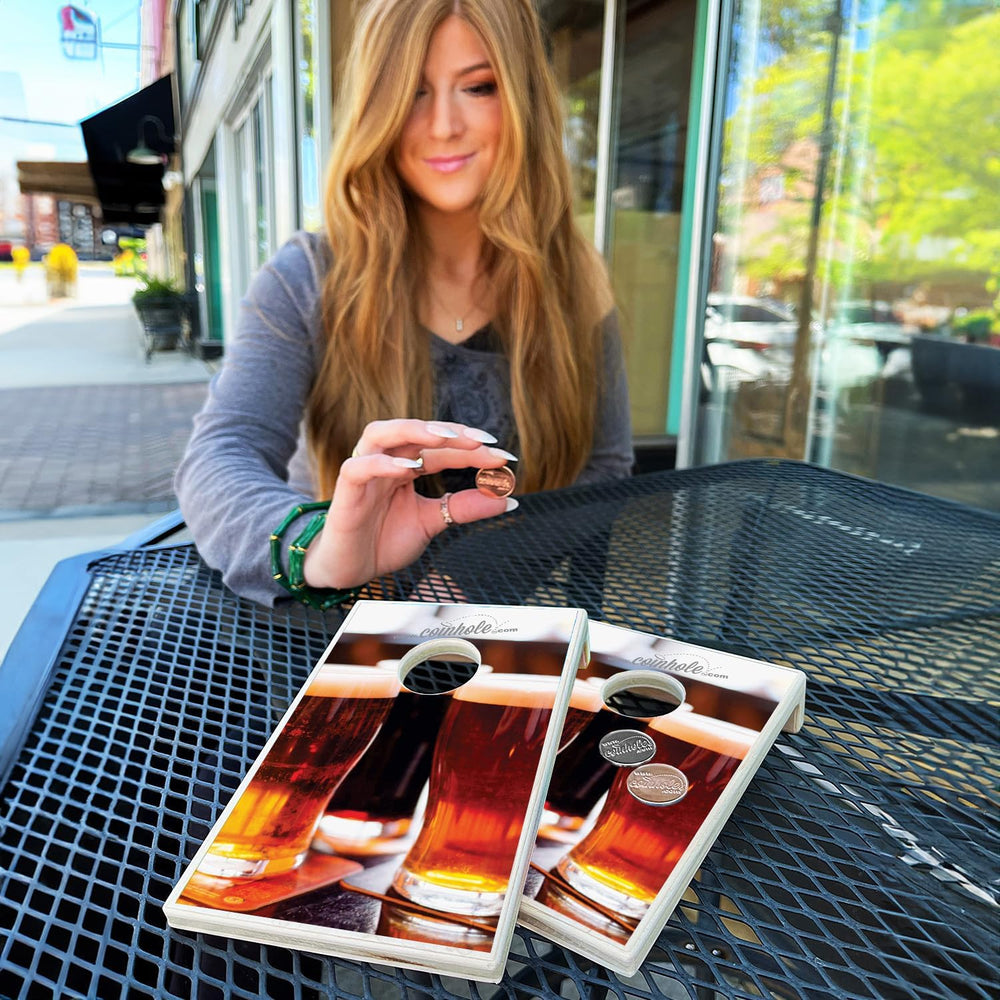 Juego de Mesa de Monedas, Set Cornhole, Incluye Vasos de Cerveza